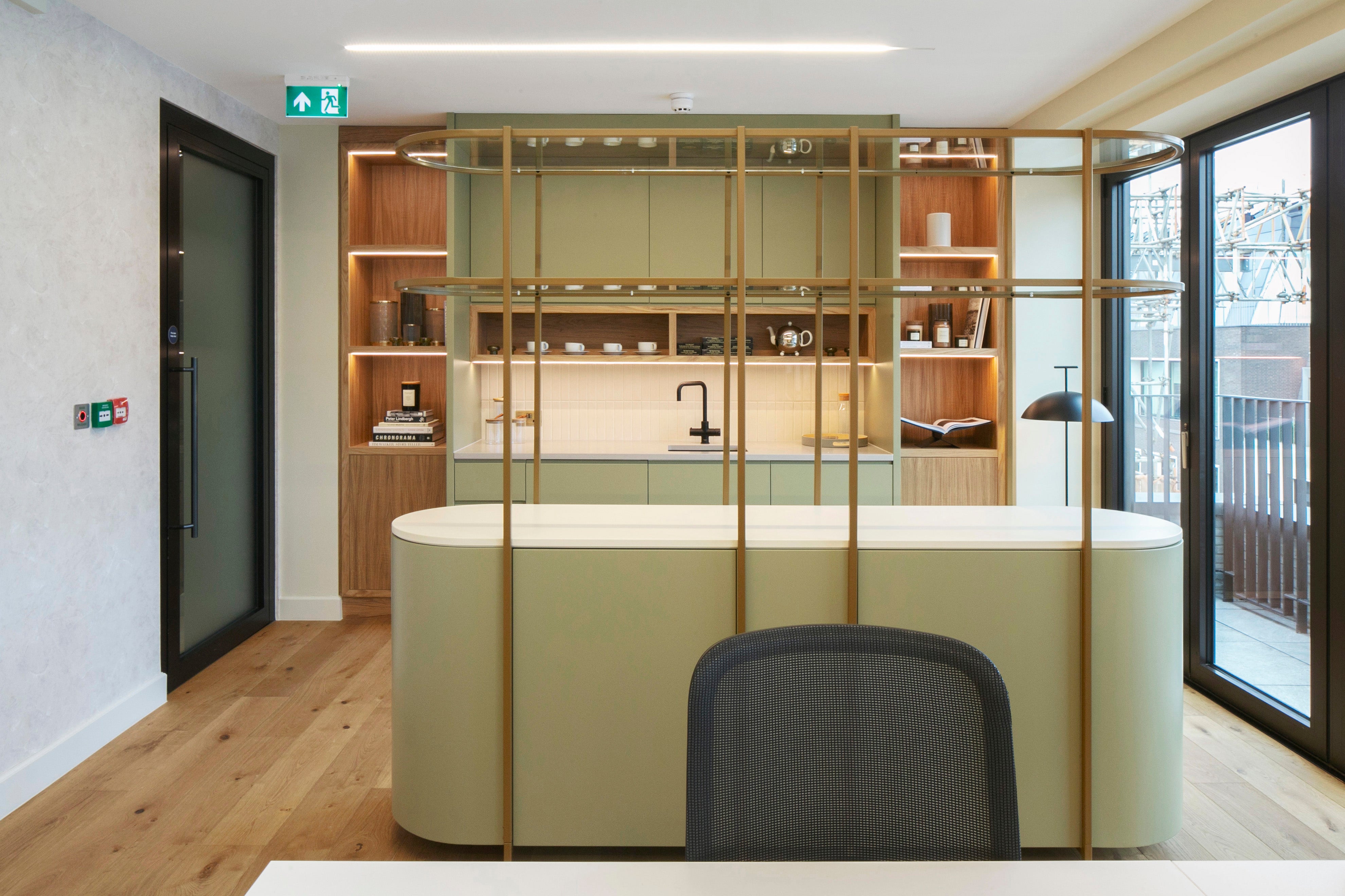 The final design effortless merges contemporary style with the traditional feel of the building. Thanks to the European oak flooring and bespoke joinery in the kitchen area, there's a cozy, lived-in feel throughout the office. The olive-green paint adds to this rustic charm, especially when paired with the elegant gold hardware. But it's the rich smoked tones that really steal the show, perfectly complementing the building's natural heritage and tying the whole space together in a way that feels both modern and timeless, as Loop go on to say…