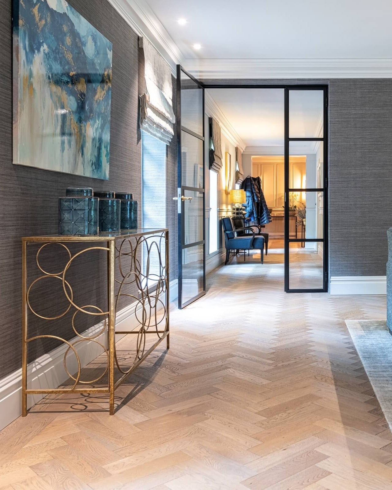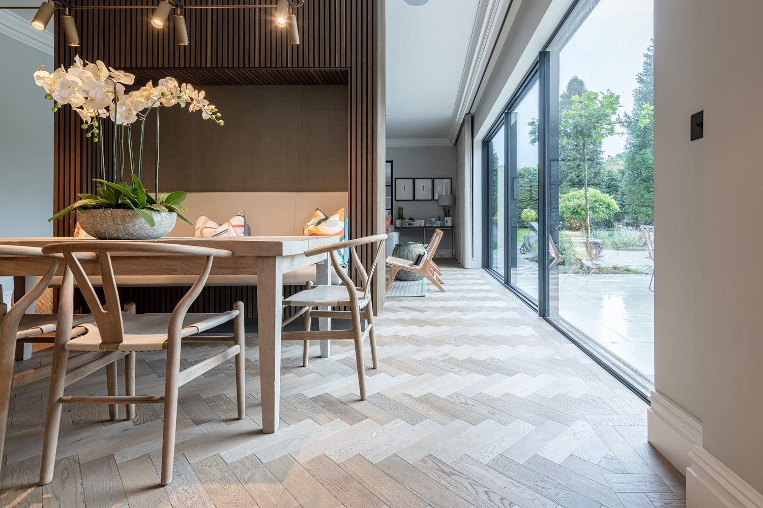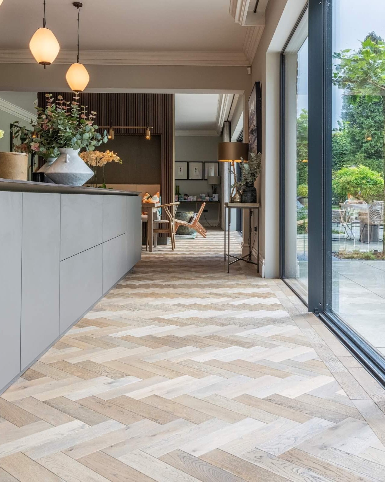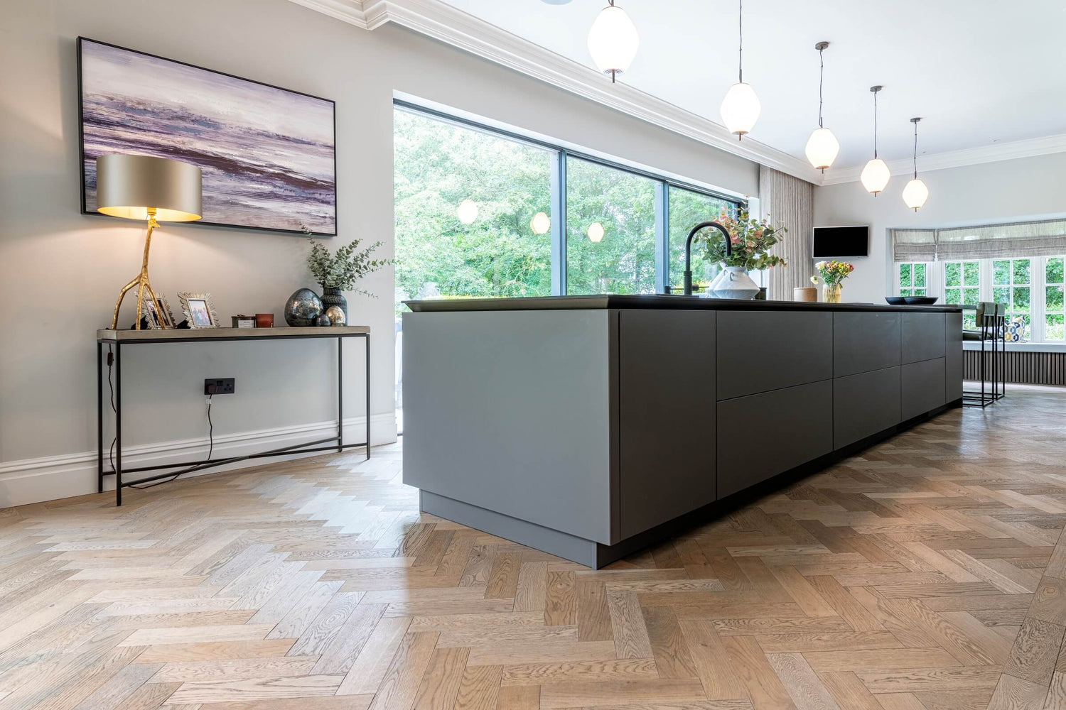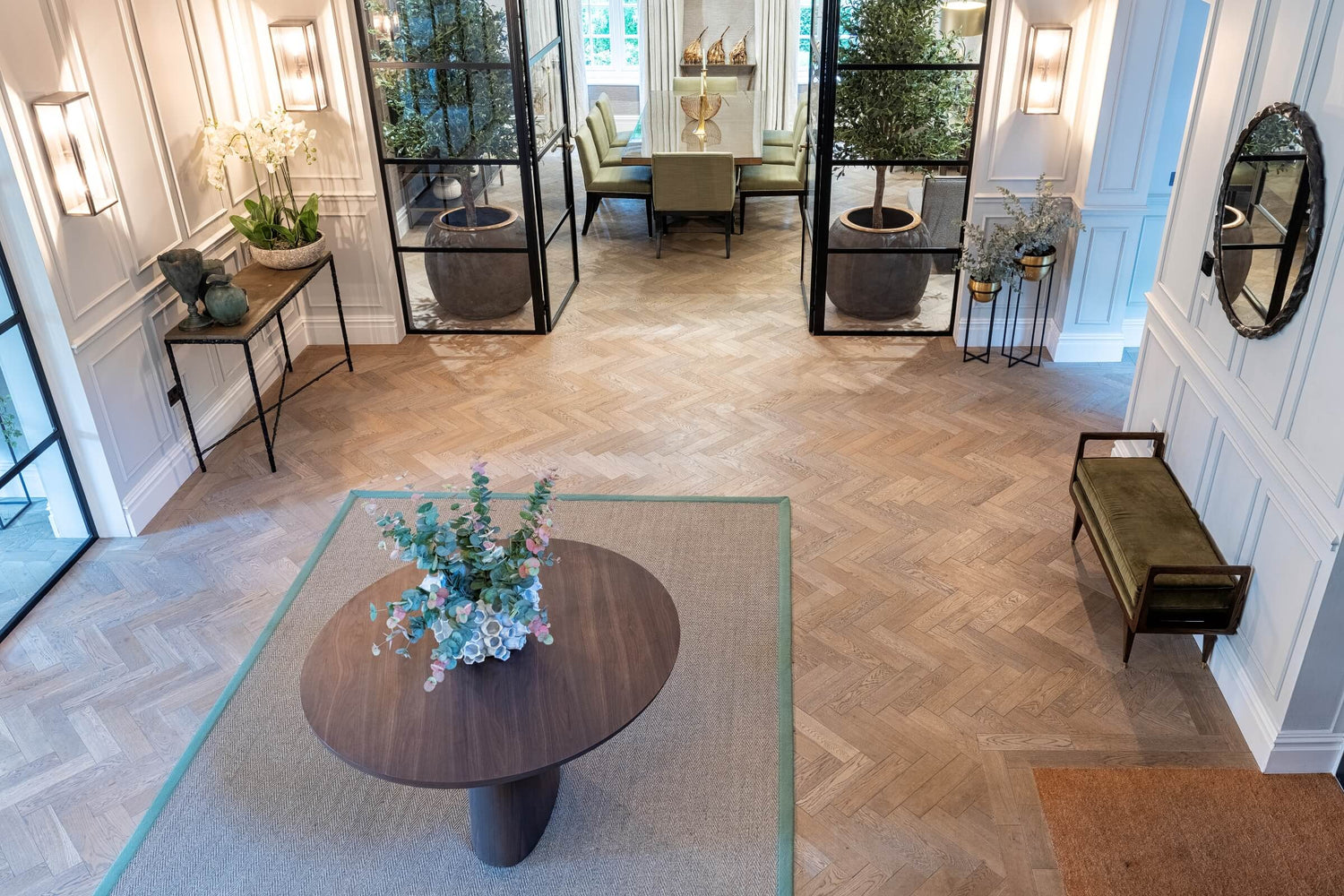 This impressive country house in the picturesque village of Harmston, Lincolnshire has been completely modernised by its new owners, who selected our Deco Frozen Umber herringbone to create a uniform floor finish flowing through the principal living spaces.