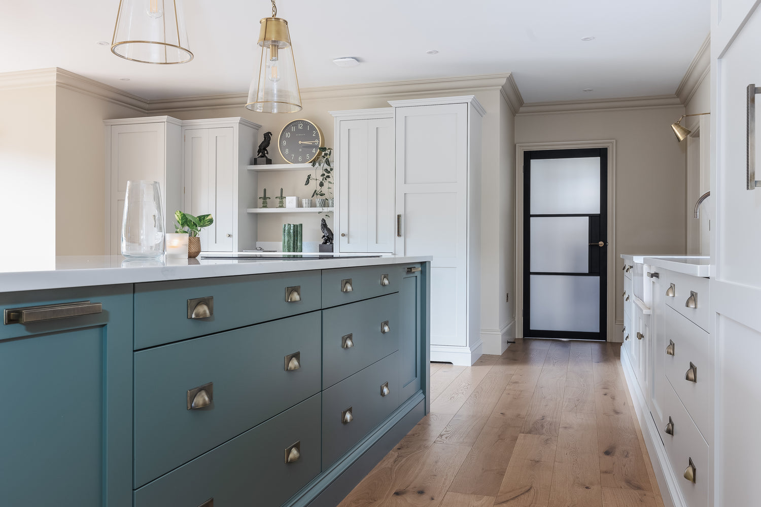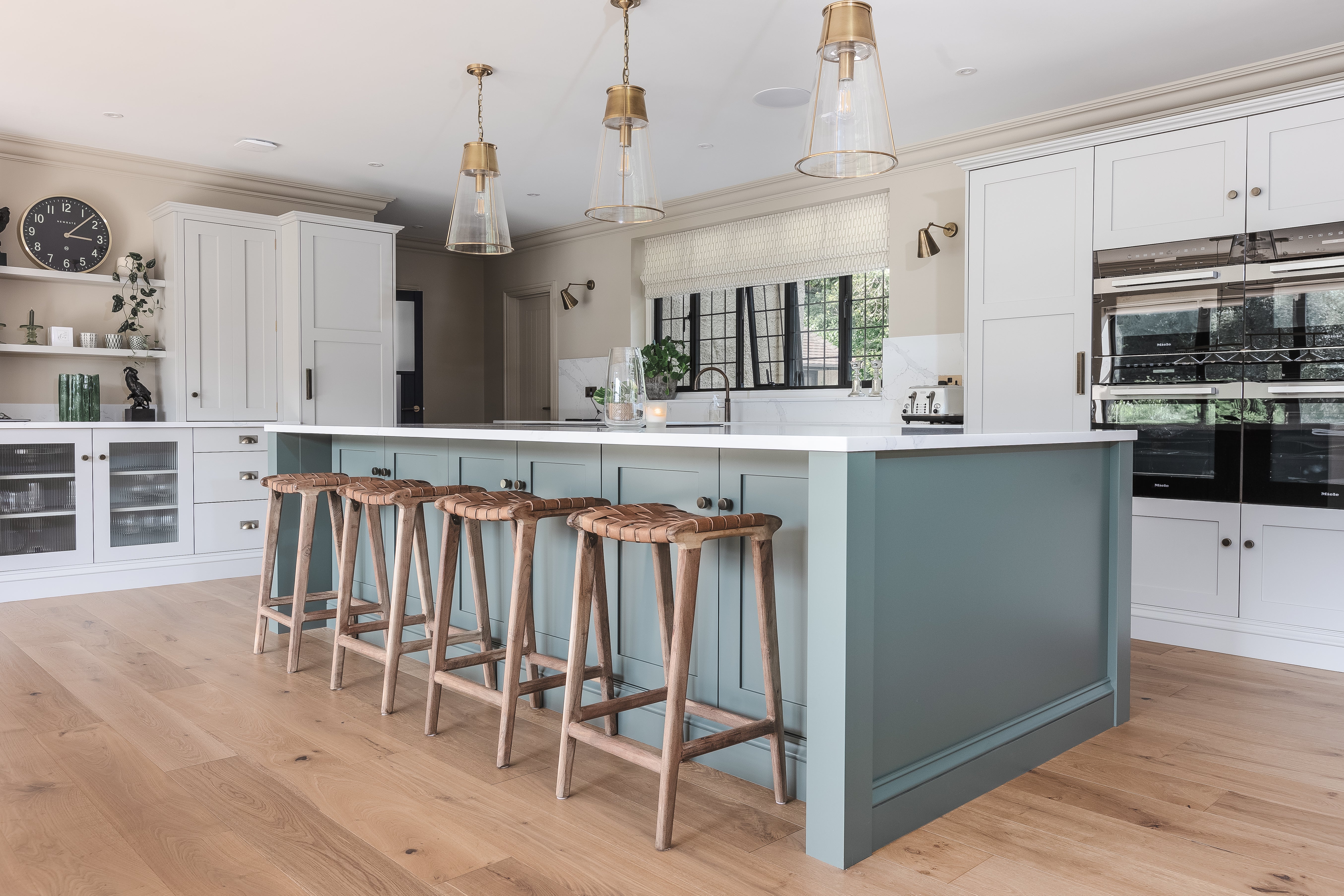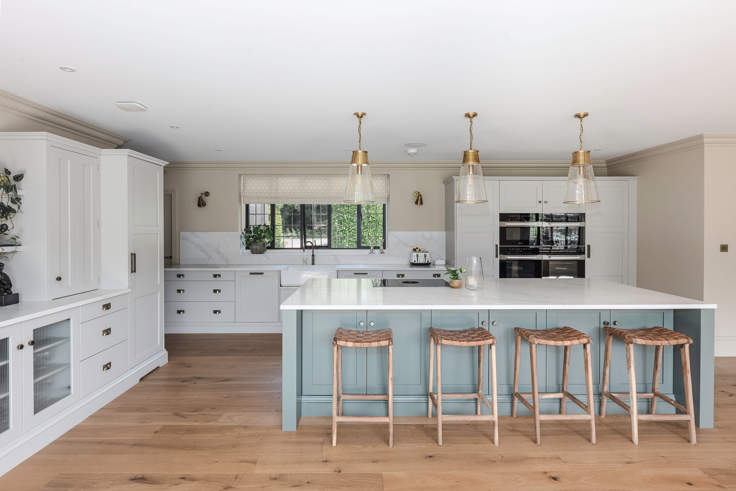 The end result is a beautiful open space, complete with the perfect balance of light from the large windows, and warmth from the rustic floor. The herringbone-covered entrance creates the desired statement when you first walk through the front door, before leading you to the adjoining rooms where the matching plank flooring completes the timeless flooring design. To finish the design, the uplifting colour of the blue island in the kitchen pairs perfectly with the white walls and oak floors to add some warmth to the cabinetry whilst maintaining the light and airy design; the blue features are then subtly carried on throughout the home with through the upholstery and cabinets.