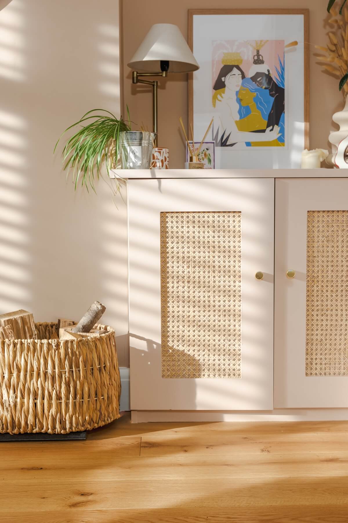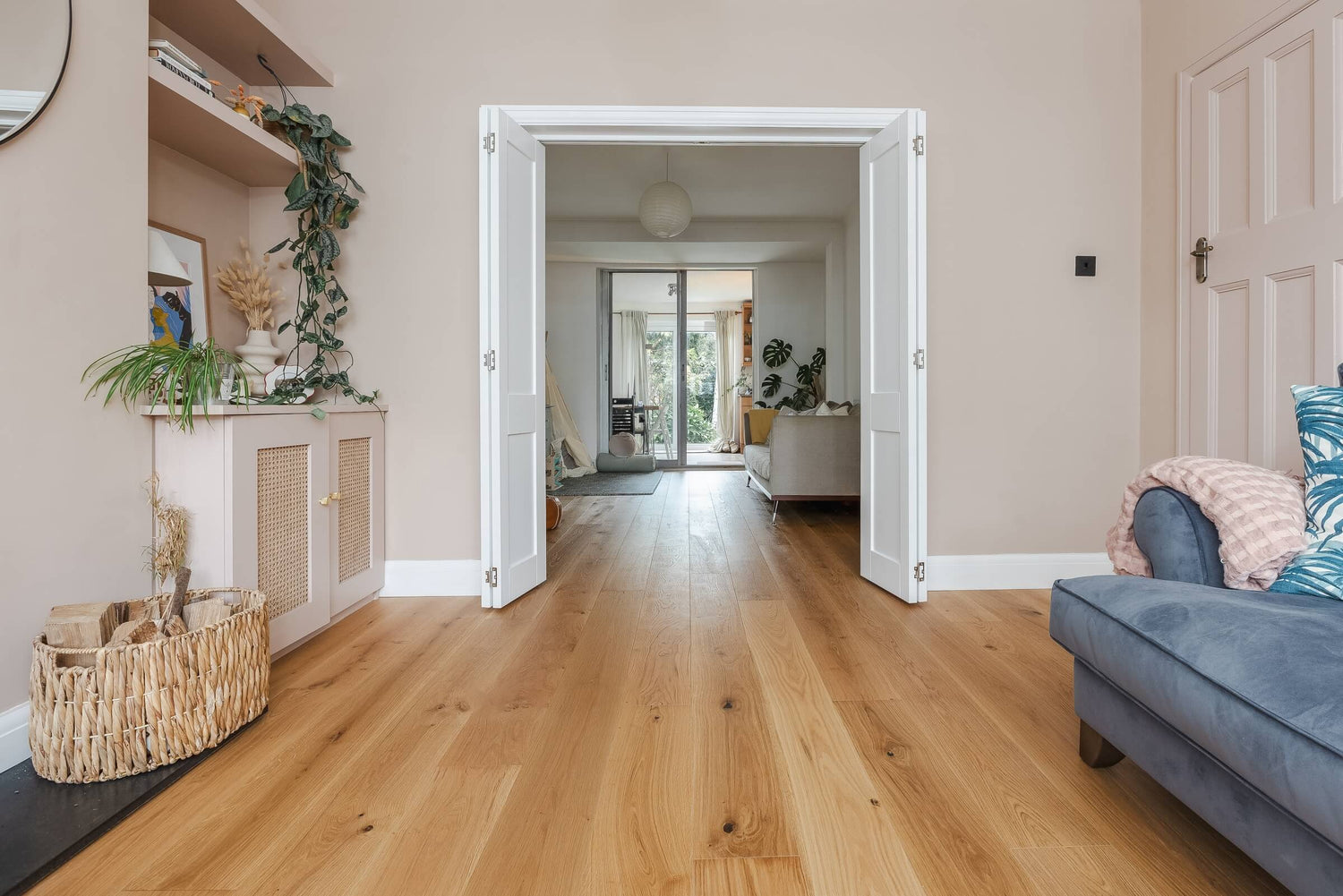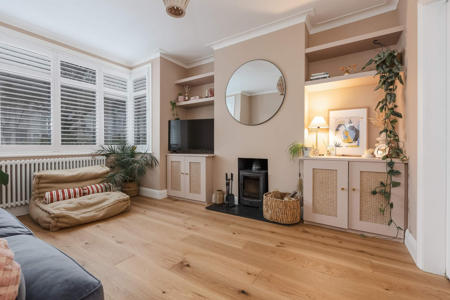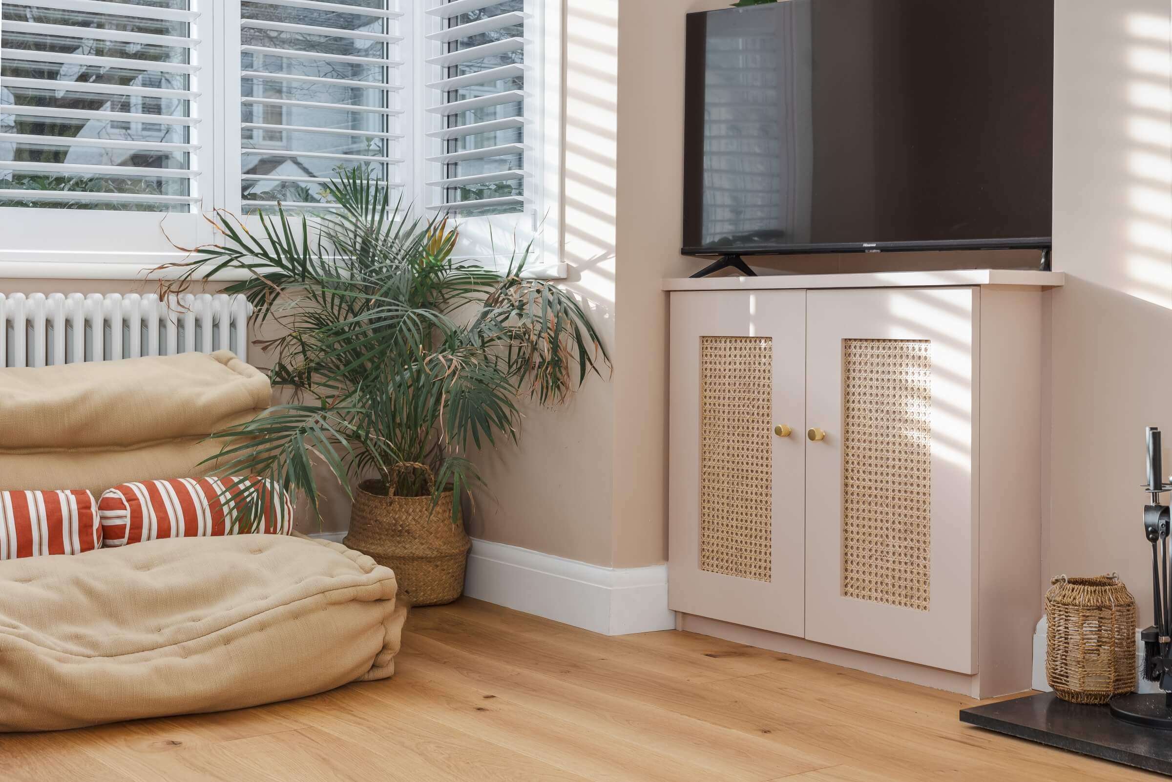 The walls were finished in the dusty plaster pink tones of Setting Plaster by Farrow & Ball, creating a soft backdrop for the natural materials used throughout the room. Bespoke rattan-fronted cabinetry and doors were created by a close friend, adding both texture and unique character to the design, whilst also providing practical storage for family life.