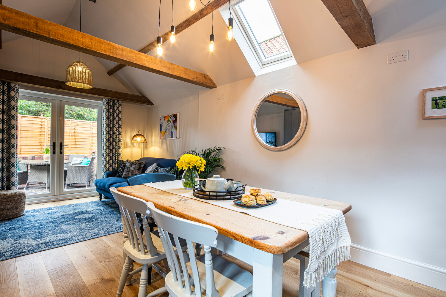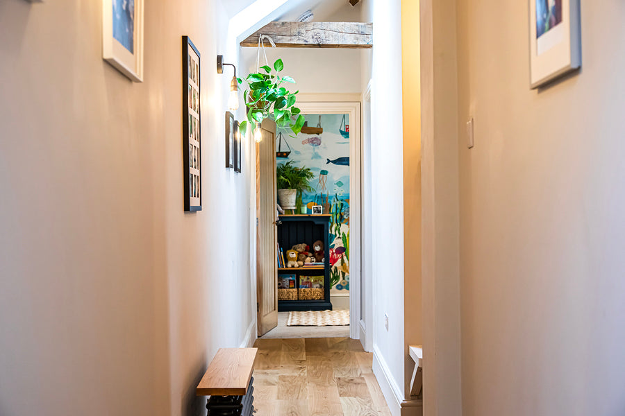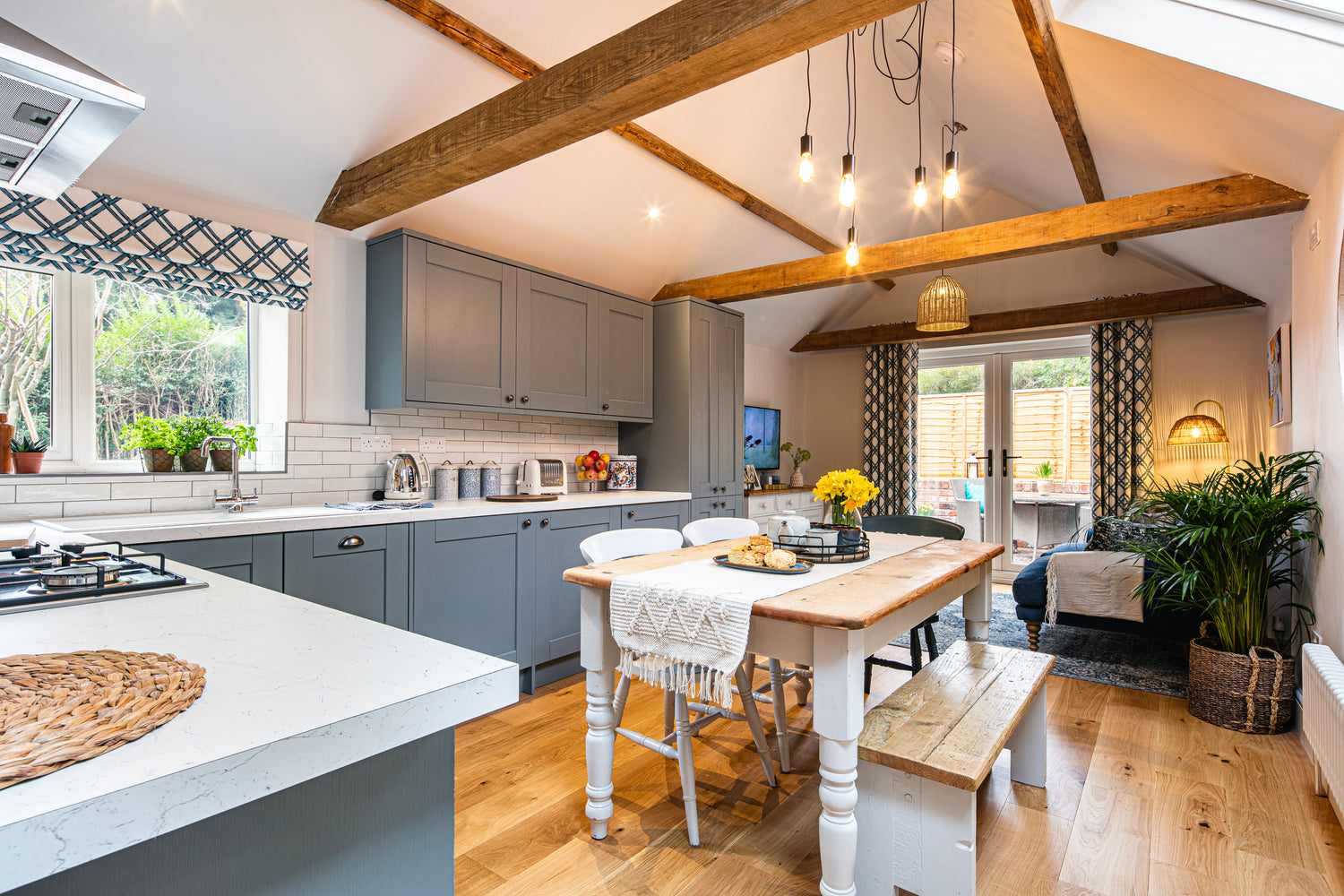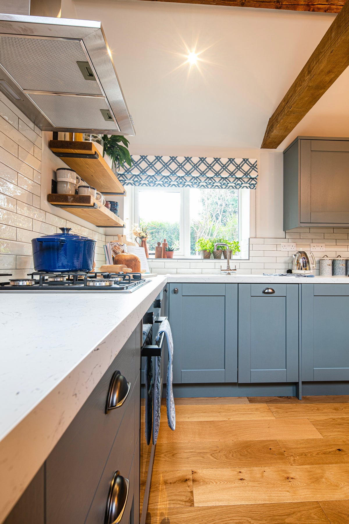 The end result was a heartwarming quaint family home for Charlene and Louis to live in, with two bedrooms and a beautiful contemporary-rustic inspired open plan kitchen come family room for the whole family to enjoy. The blue shaker-style kitchen added a colour to the design, sitting effortlessly against the white walls, which balanced perfectly with the matching oak beams and flooring throughout that home – which also offered a subtle nod to the building’s fascinating heritage.