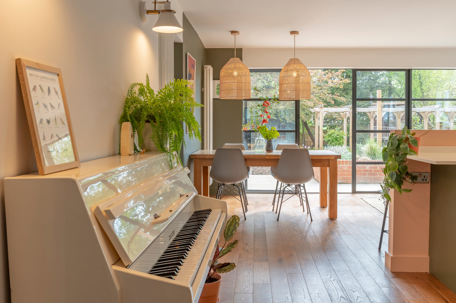 The finished room certainly meets the brief for a more family friendly space that feels natural, calm and connected to the garden. Bespoke colour paint was mixed to the same green of the kitchen fronts, applied to a feature corner wall in the dining area which creates a natural connection between the kitchen and this part of the room. The remaining walls are kept to a minimum with off white tones and bright artwork pieces have been selected to add pops of colour. Plenty of green plants add additional greens into the room and earthy tones are introduced through the different wood surfaces that feature in the space including two striking rattan pendant lights above the dining table.