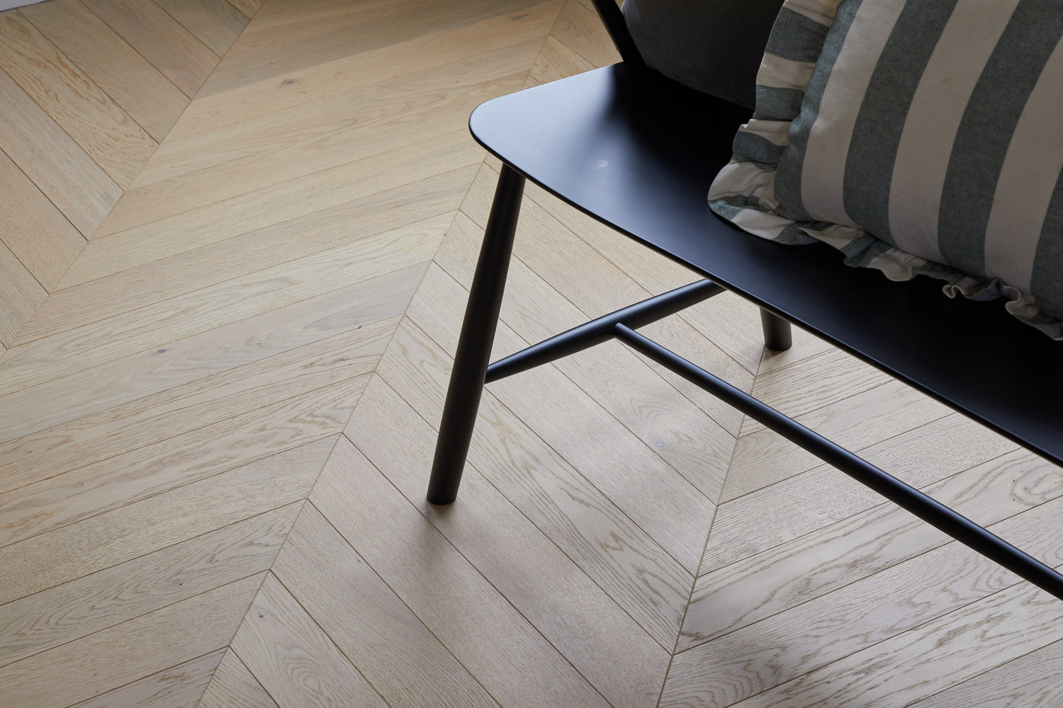 Seashell is a rustic grade floor, light in colour and complete with a brushed and oiled surface layer. Its engineered construction makes it perfect for underfloor heating, whilst the 45° angled headers fit perfectly together to form the chevron pattern, offering a contemporary twist on a classic 17th Century French herringbone style floor. Seashell was the perfect fit for this family’s design brief, as Eleanor explains: