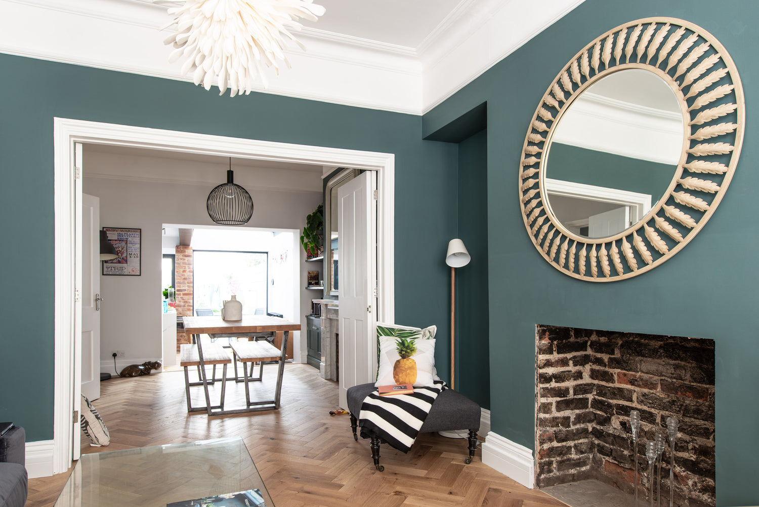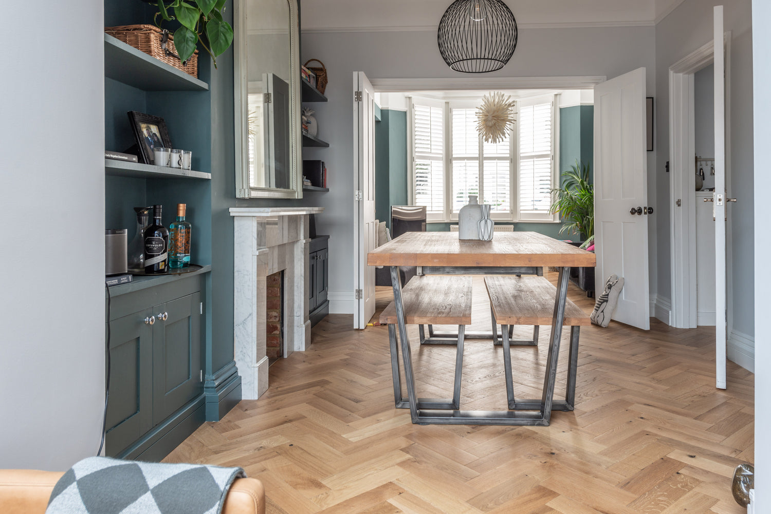 Keen to maintain some Victorian features, reclaimed bricks were used to create the exposed brick wall and steel touches were introduced into the kitchen design. Finishing the textured palette is Deco Parquet Herringbone Oak wood floors. A modern take on parquet, the floors have been installed throughout the ground floor to connect the existing and new spaces seamlessly. The couple chose Deco Parquet in Natural Oak. The Natural Oak wear layer is steel brushed to produce a textured surface which follows the natural grain and is sealed with a durable natural lacquer which makes the floors particularly durable for use in kitchen areas. Flowing through from the finished kitchen space, the dining area’s feature fireplace uses the same marble finish as the work surfaces and splashback, adding more harmony to the different zones. And the Victorian inspired dark blues of the kitchen cabinetry flow into the striking blue-green paint chosen for the walls in the living spaces. With the dining area doors opened up to the living room the natural flow of the spaces is beautifully accentuated by the Deco Parquet herringbone patterned floors that run throughout the ground floor of the home.