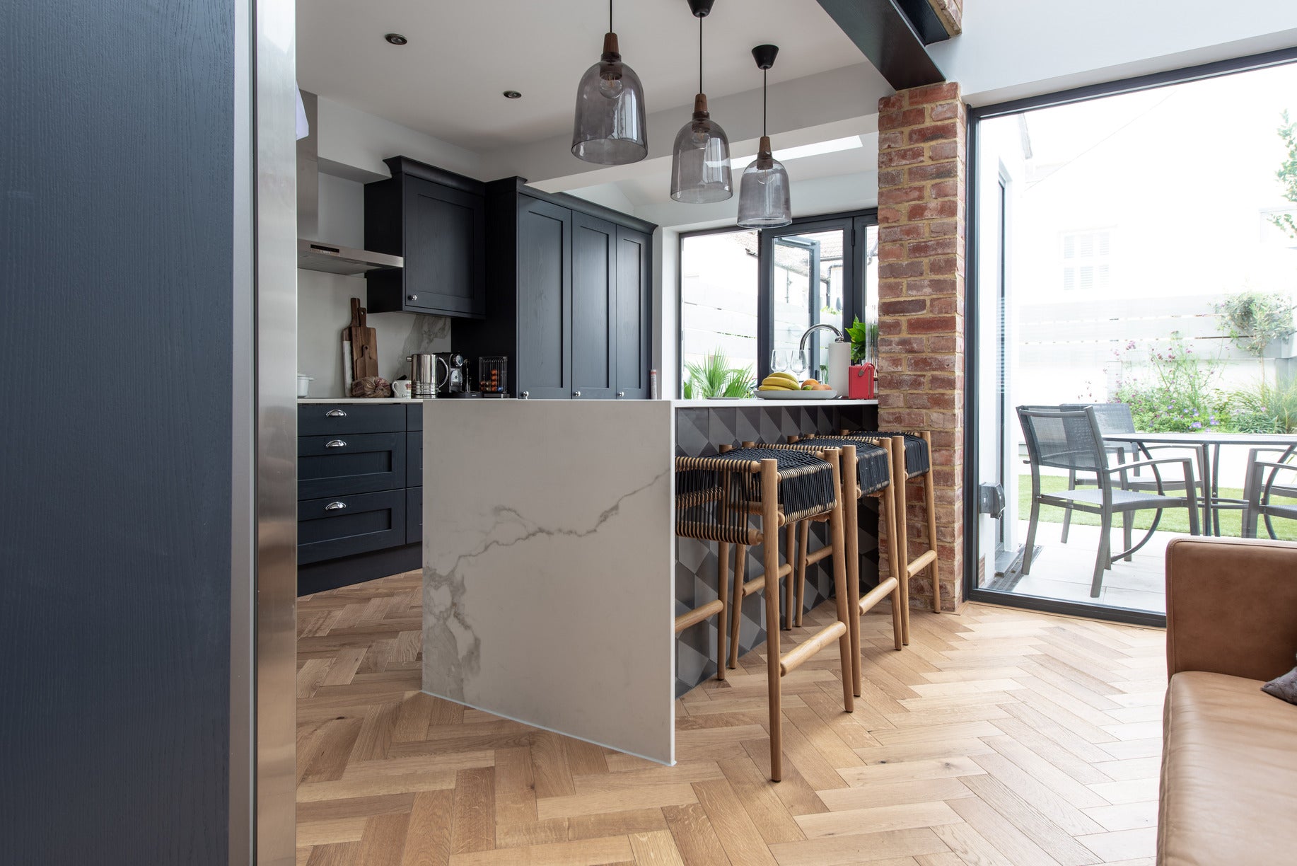 The finished results are stunning. The use of the oversized island, glass wall and ceiling and natural flow of the herringbone flooring certainly results in a design that appears anything but a compromise, instead adding naturally styled interest and design flair to the completed space. Interior design completed in conjunction with Amazing Productions Floors installed by Rob at Past & Present Flooring.View the project in Episode 3 of Series 2 Old House New Home at Channel 4 on demand.