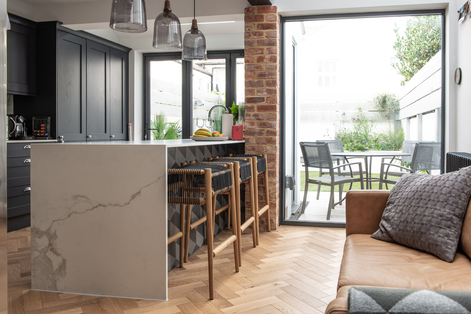 At the top of the couple’s wish list was a kitchen island and the new design focused on creating a central, oversized island that would connect the L-shaped extension walls and bring the living zones together. A modern glass wall and ceiling would counter the shorter extension walls permitted to the right of the space, giving a light and contemporary finish that matched the bi-folds installed to the other side that lead out to the garden. A dark blue Victorian inspired colour was used for the kitchen units, delivering sensitivity to the period age of the home, whilst contrasting with a modern white marble work surface and splashback. And geometric tiles added to the island add contemporary flair.