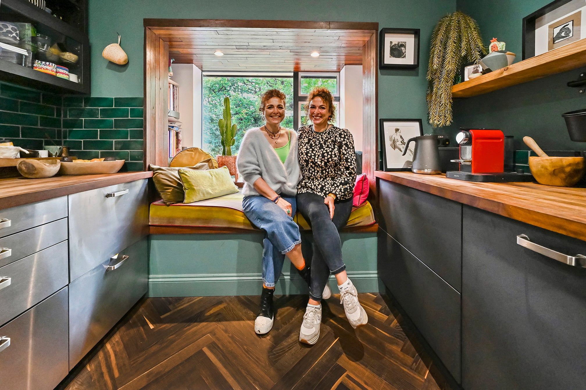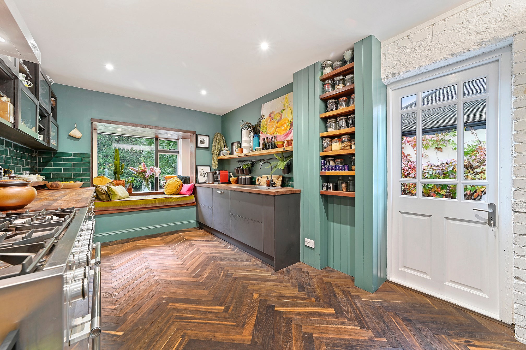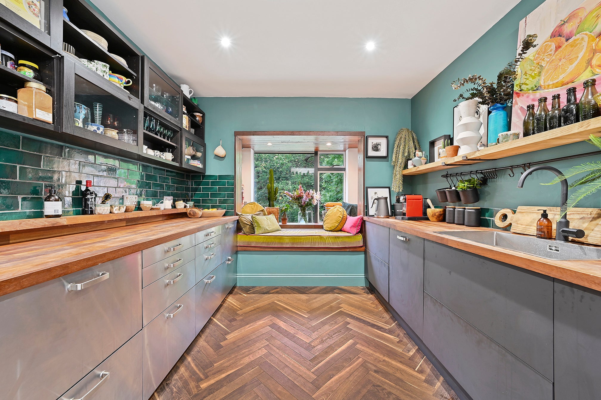 In addition to creating a relaxing space, the window seat also accompanied many practical changes in the home, interior designer Emma explains: The kitchen had to be more practical. A new layout has meant they have been able to double the storage space without extending the room. Sarah wanted the space to feel as cosy as any other room in her house and continued the use of green hues and rustic wood into the kitchen to flow from the rest of the house. Open shelving means Sarah gets to display all her handmade crockery and colourful prints and her velvet cushions in the window seat area makes it the perfect place to perch"