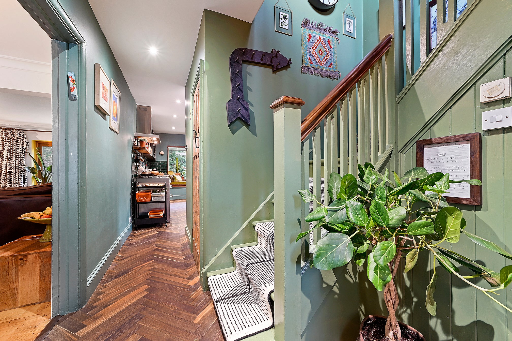 Continuing the theme of connecting the home to the outside, Emma notes They love the combination of the rustic wood flooring and green walls and feels it reflects the colours of the outside. Sarah and Martin are fortunate to have a large garden which they love and bringing the outside in was important, introducing earthy shades contributes to the homely feel in the room. Sarah and her husband Martin love the combination of the rustic wood flooring and green walls and feel it reflects the colours of the outside… bringing the outside in was important, introducing earthy shades contributes to the homely feel in the room.