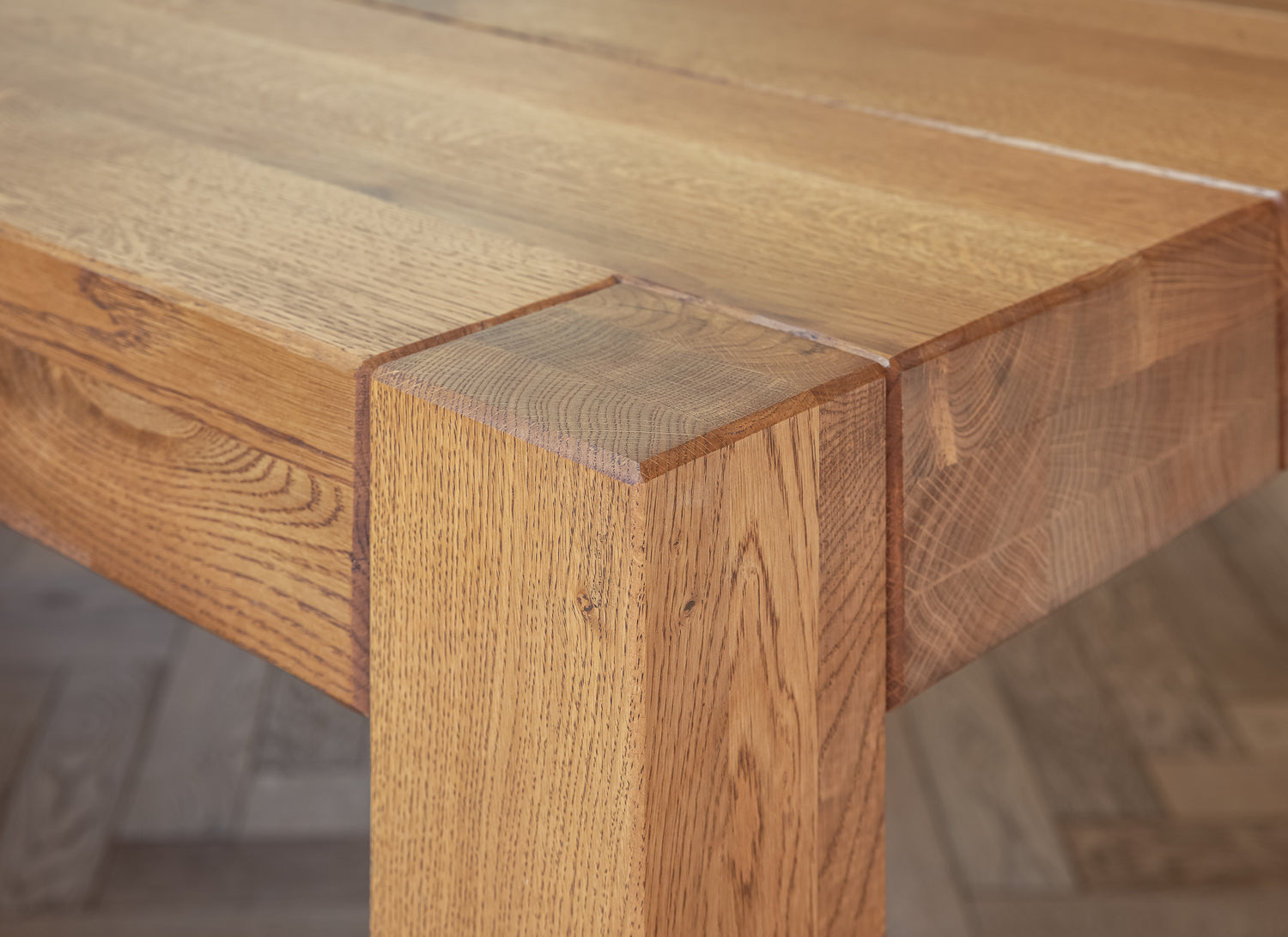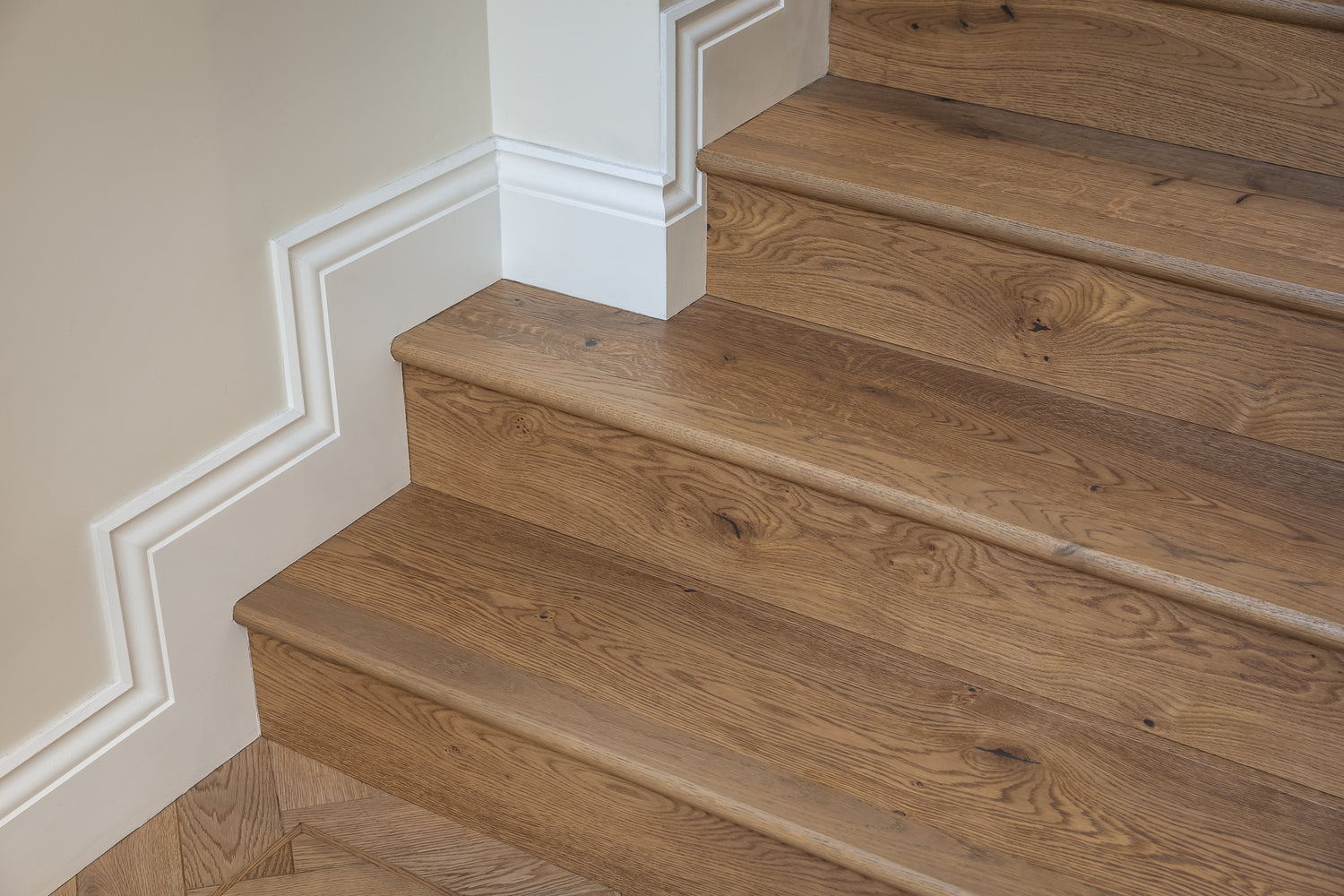 each board, before being sealed with a white UV oil to create a contemporary, muted-oak hue. At 1900mm long and 190mm wide, the planks are perfect for drawing your eye along a room and opening up the space; whilst the 400mm long parquet blocks are great for creating a seamless design that flows throughout an open plan room.