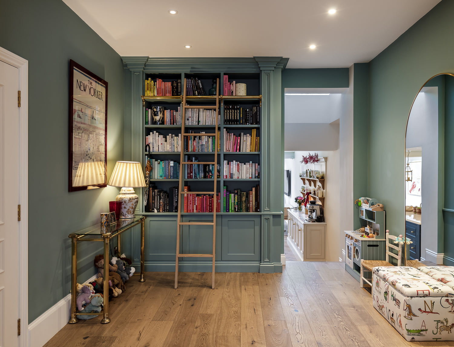 When it came to furnishings, the rustic oak planks beautifully complemented the teal blue walls in the library, whilst Louise and Ryan coupled the contemporary parquet kitchen floor with both white walls and units, contrasted by a navy-blue island to create a design filled with depth and light. The kitchen-come-dining room was then completed with one of our bespoke Lineage Solid Oak tables and benches, in the colour Mars Madder, continuing the use of natural materials throughout the design. Available in a variety of sizes and colours, these made-to-order table and seating options are the perfect addition to any home.