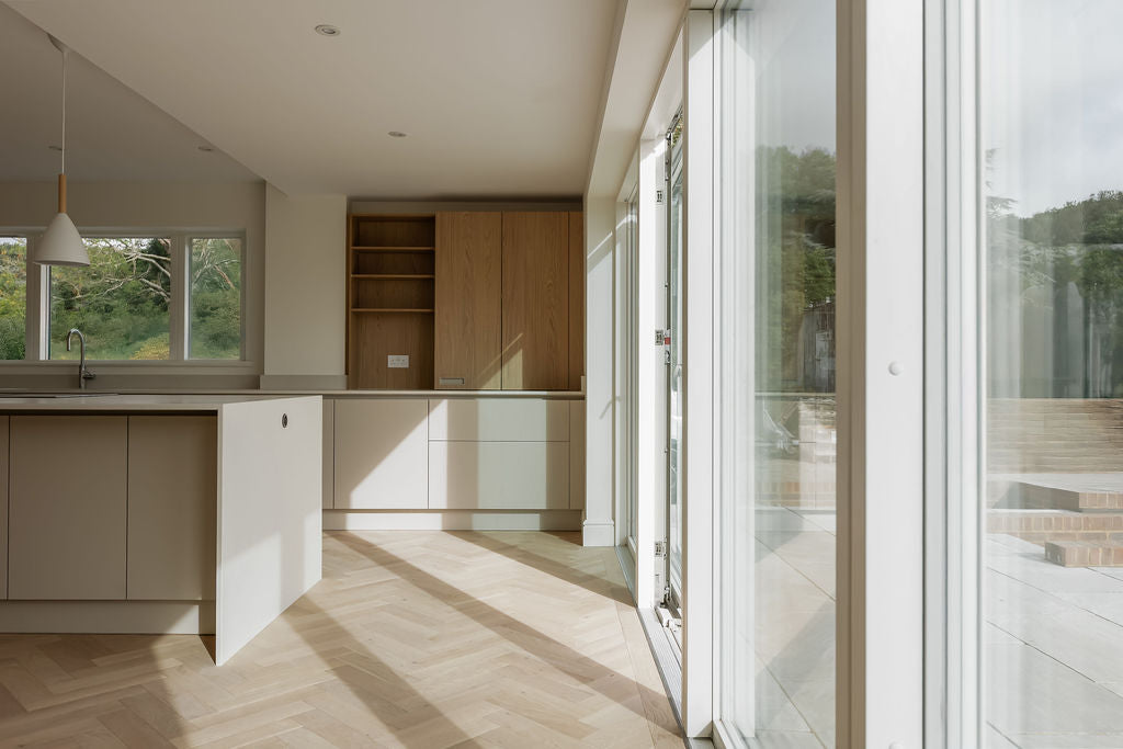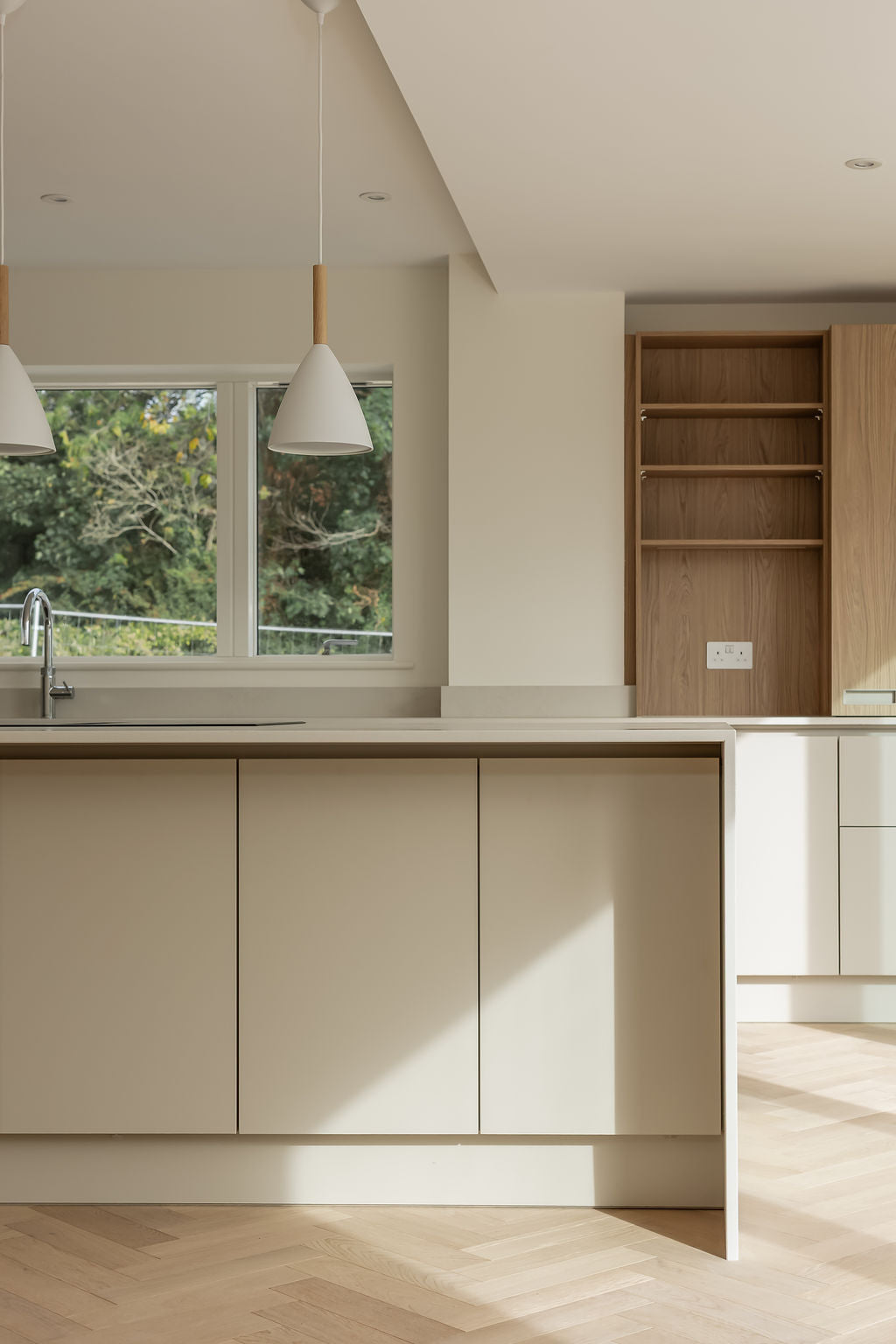 The chosen Shore Drift Oak floors sit so harmoniously with the neutral tones of the bespoke kitchens, and the expanse of doors and windows allows so much natural light to filter into the rooms, further accentuating the bright ambience in these spaces.