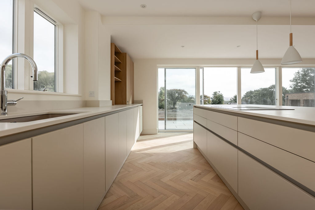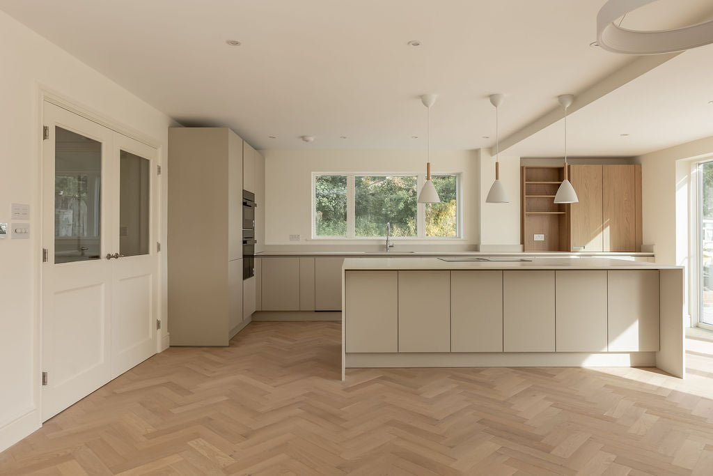 “The kitchens were fitted first, and then we handed over the job of the flooring installation to Neil and his team at We Know Flooring who did an incredible job in perfecting the beautiful herringbone pattern as it runs throughout the spaces. They were able to advise us on the sequencing of laying the floors, in such a big space it needed to be just right from the kitchen fitting and electrics and plumbing, to the thresholds for doorways.