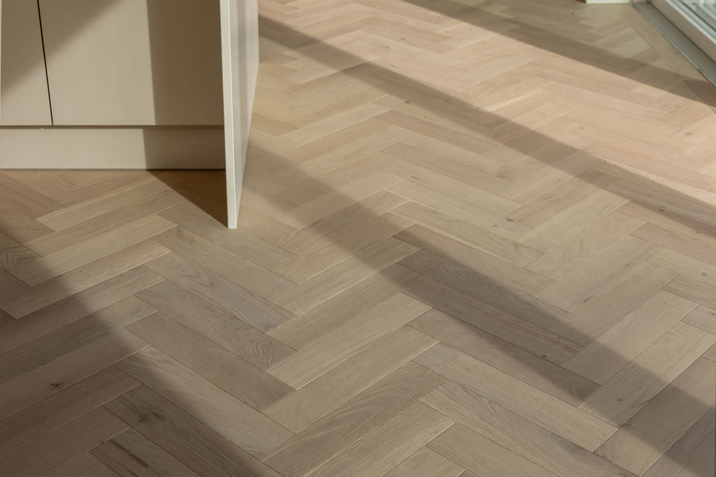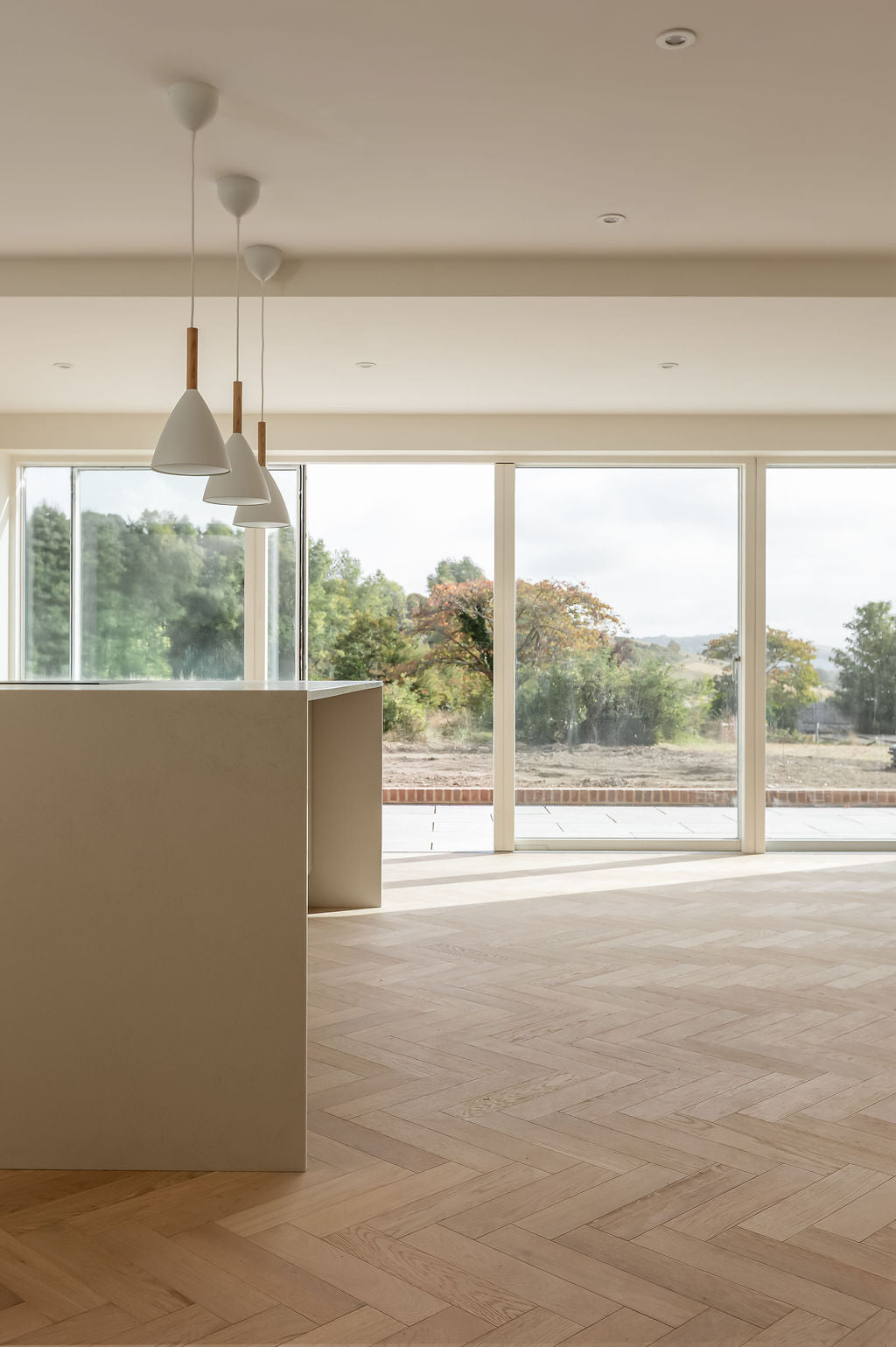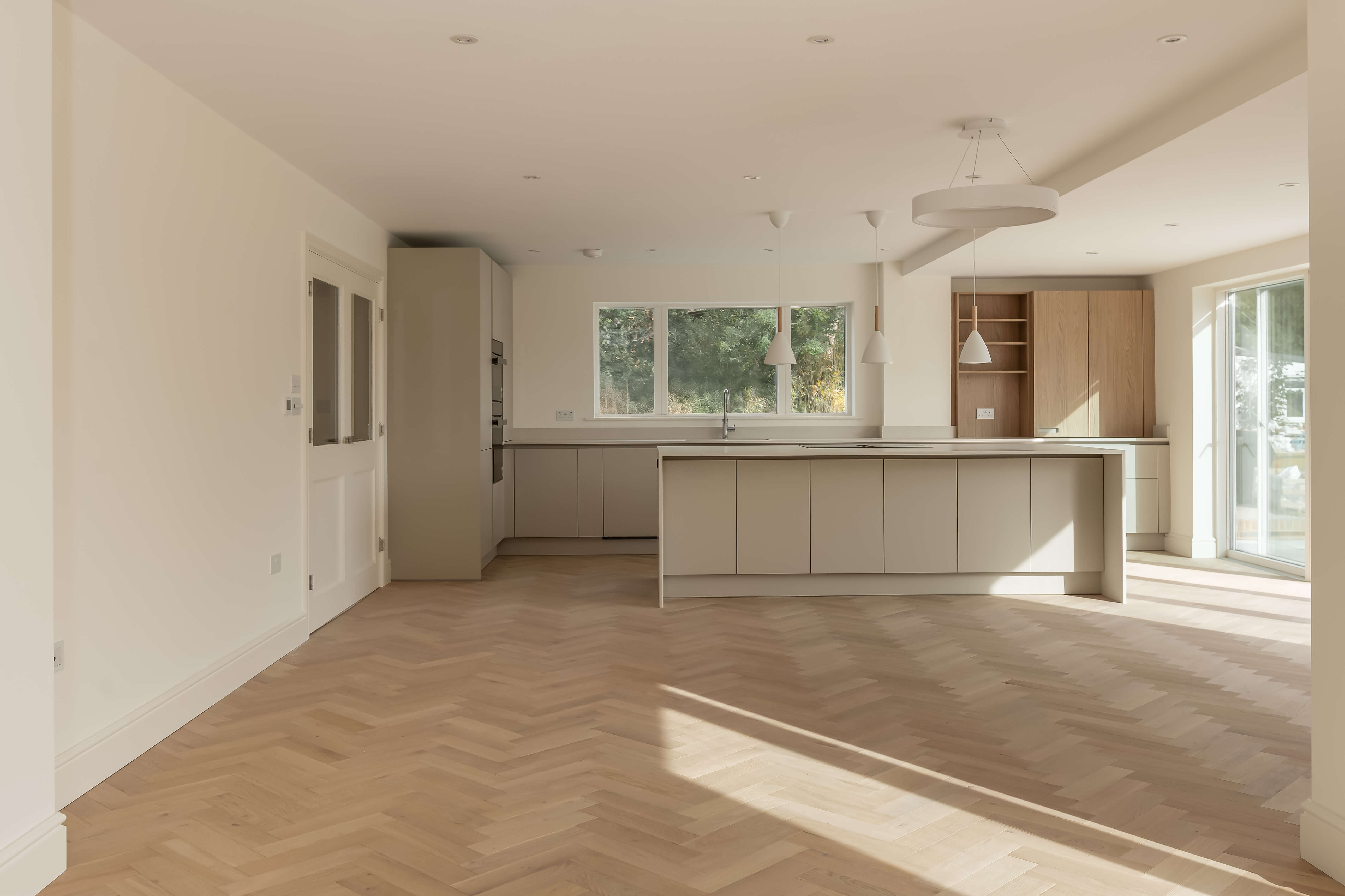 Two beautiful new-build homes, located by the South Downs National Park, have their contemporary open-plan living spaces filled with the naturally light oak tones of ZB204 Shore Drift Oak herringbone.