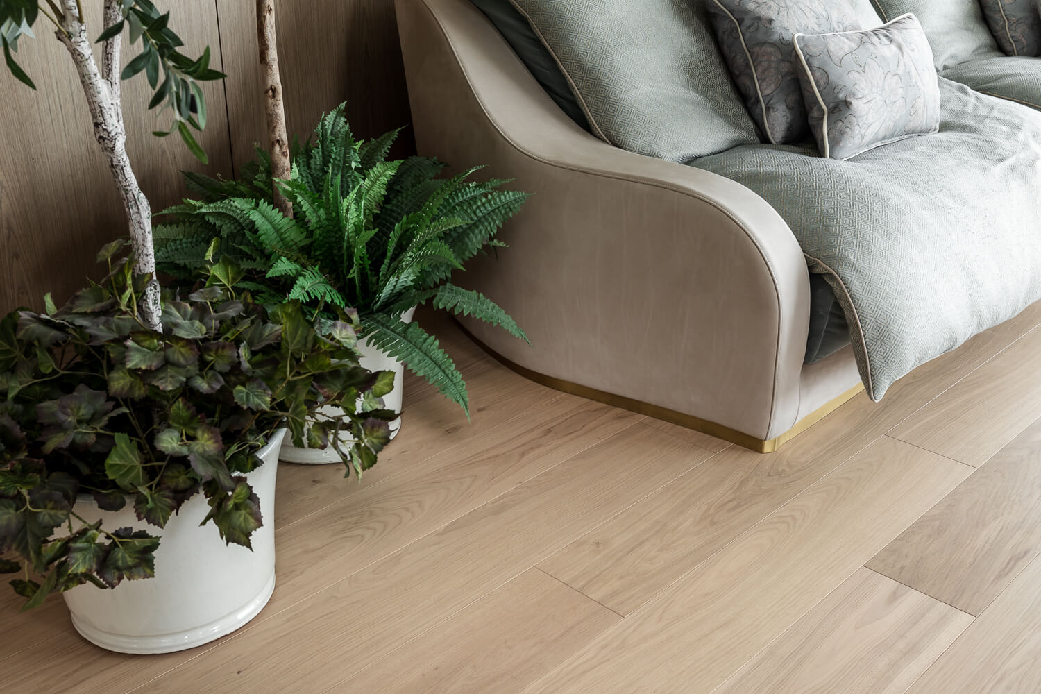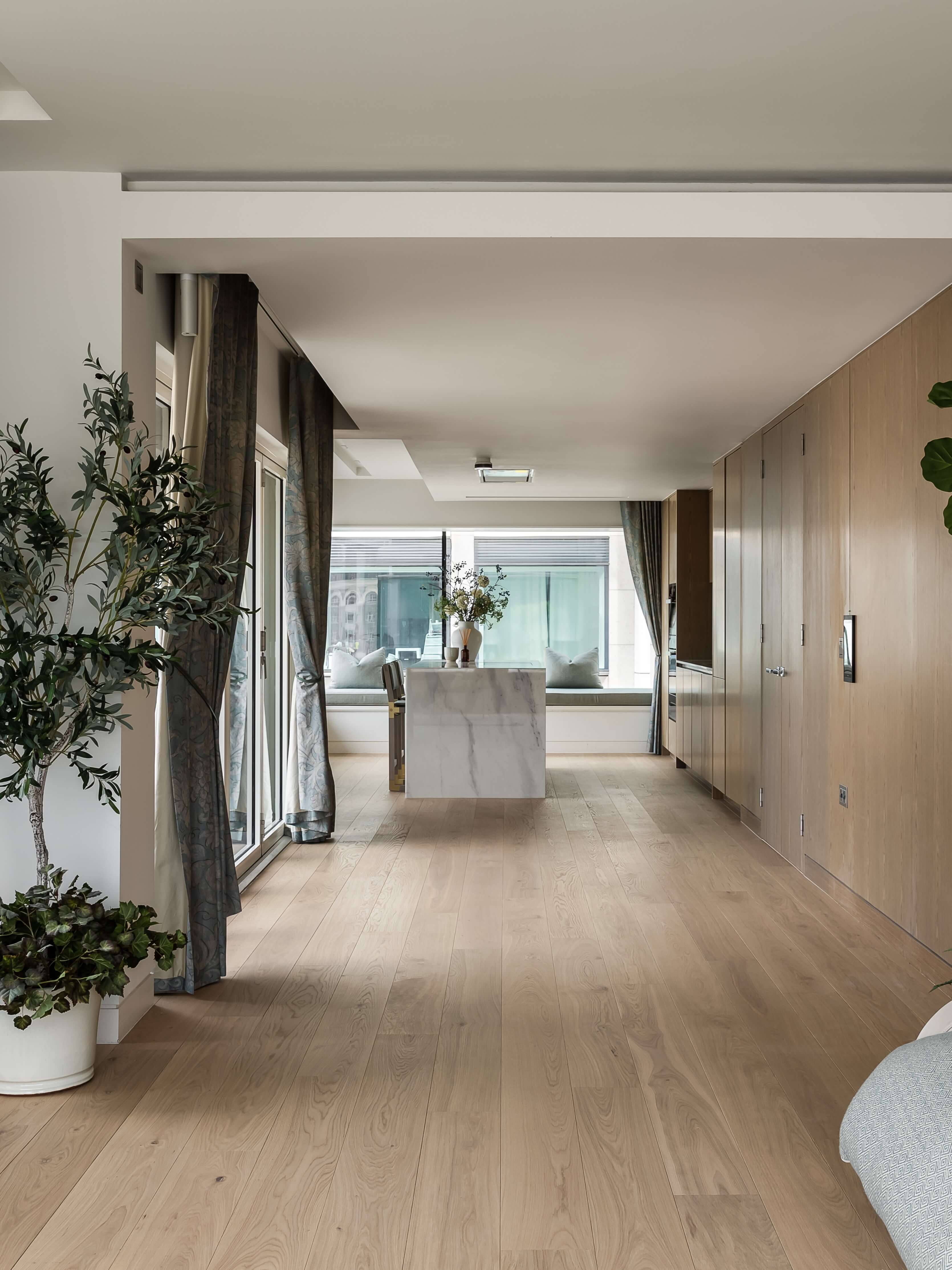 The owner of this London Riverside apartment wanted to upgrade the ceramic flooring in her open-plan living space with a natural engineered oak floor to create a warmer, more luxurious design, choosing Tundra Seashell planks.