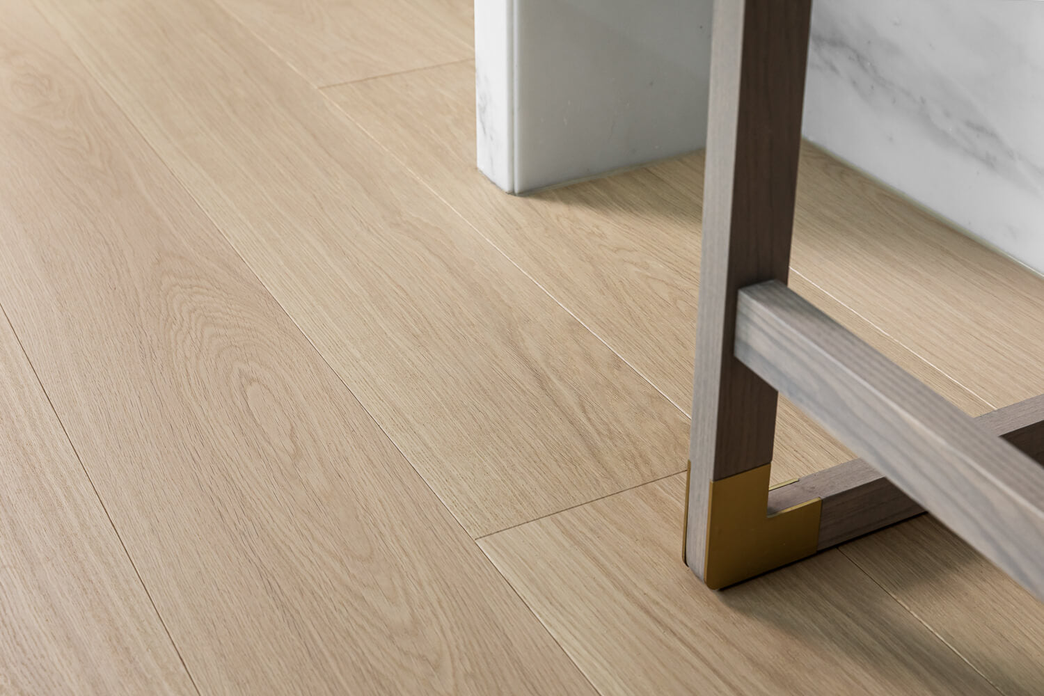 The Seashell finish is created through a subtle blend of white oils buffed into the brushed oak surface. The result is a soft, contemporary tone that retains the appearance of an almost raw, untreated timber while enhancing the grain and natural character of the wood.