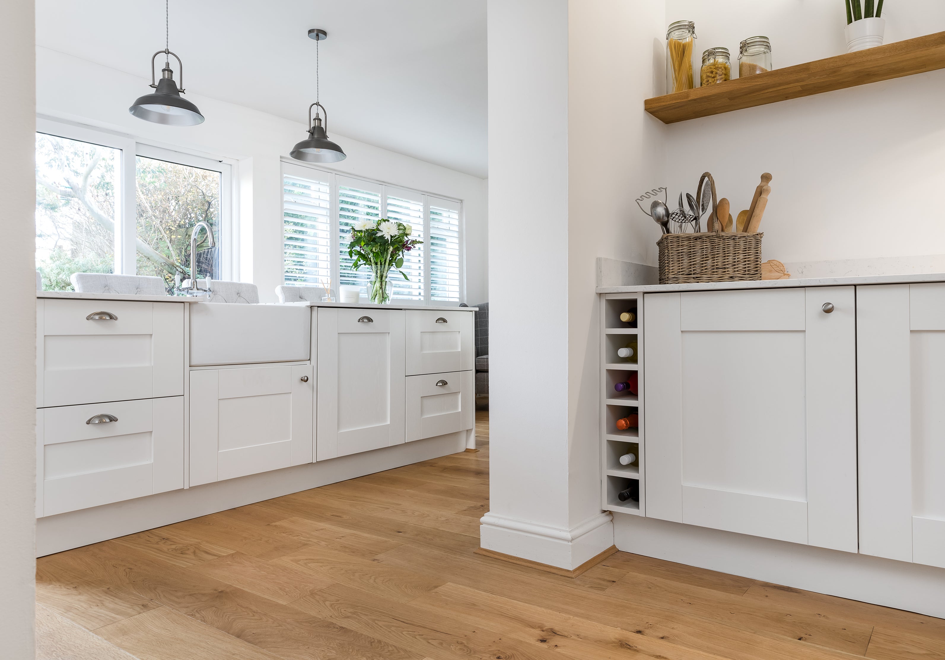 Alpine Oak Rustic & Oiled wood floors provide the perfect layer of warmth to white kitchen design in this Saltdean home.