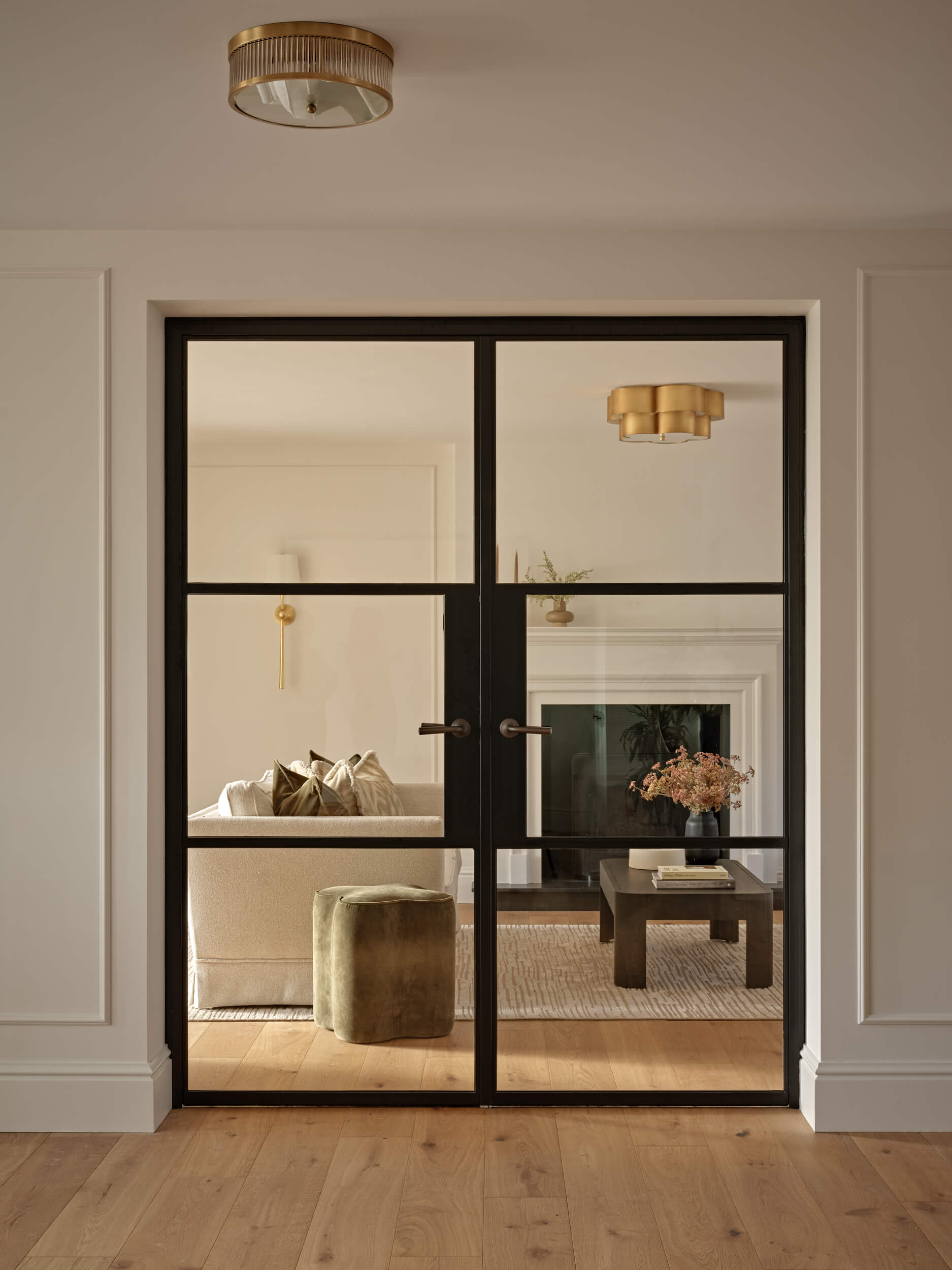 From the impressive entrance hallway, through to the elegant living room, the flooring adds modern character and natural charm, harmonising beautifully with the neutral colour palette, earthy accents, and warm brass and bronze hardware.