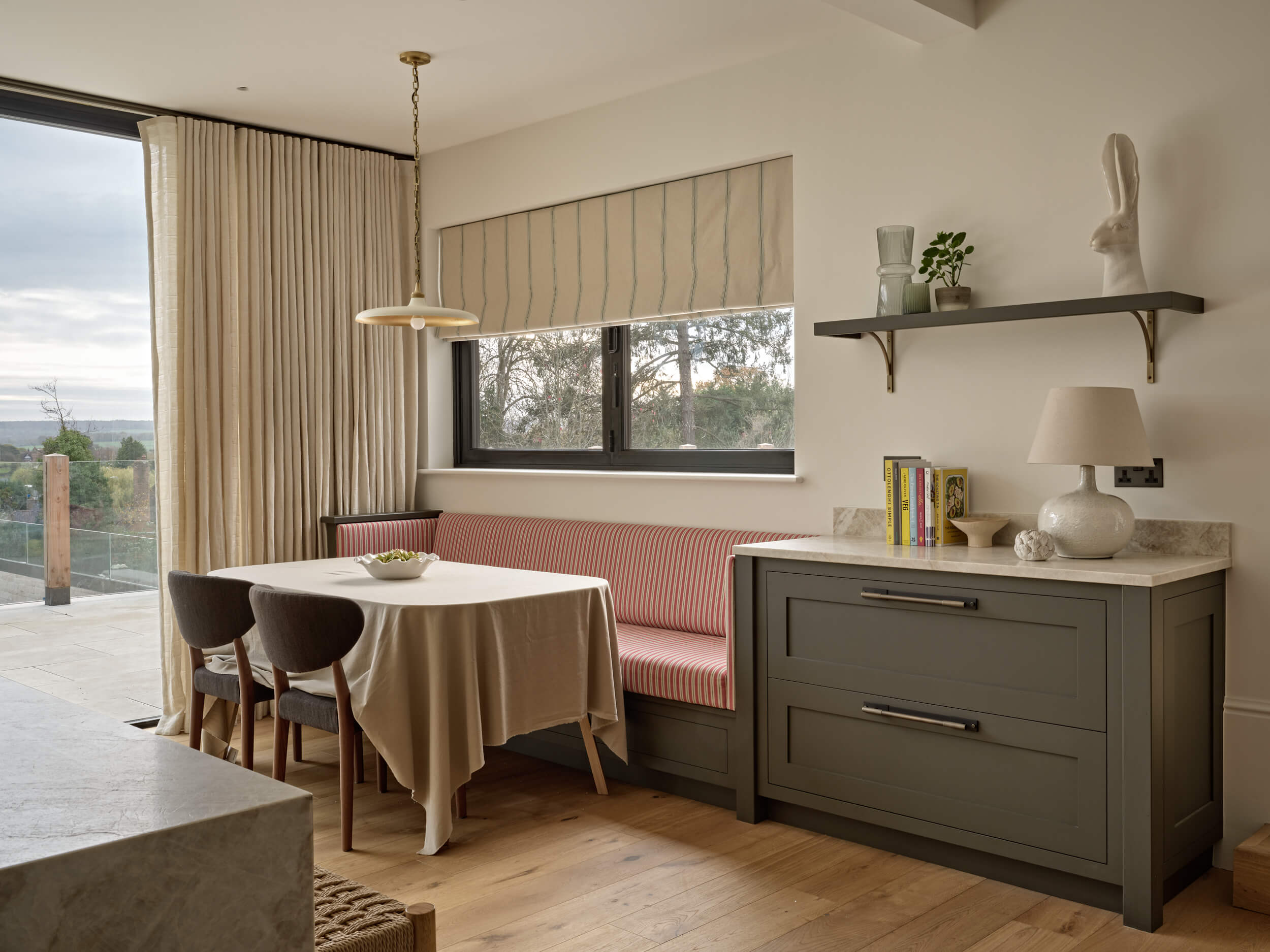 When it came to furnishings, Bec advised her clients to invest in key bespoke pieces. “We designed bespoke sofas, benches, and ottomans in durable yet beautiful fabrics, creating pieces that could withstand the demands of busy family life, while fitting the design perfectly.”
