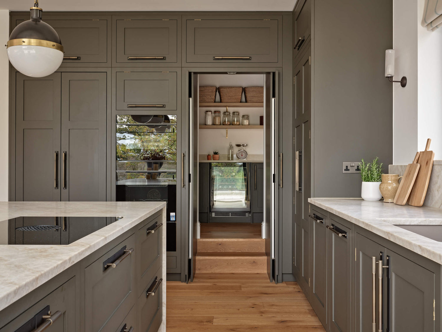 In the kitchen, the floor’s oak tones sit perfectly with the warm earthy green paint used to finish the shaker cabinetry, and natural light floods the space, connecting indoor and outdoor living, creating a bright and welcoming environment that is ideal for family life.