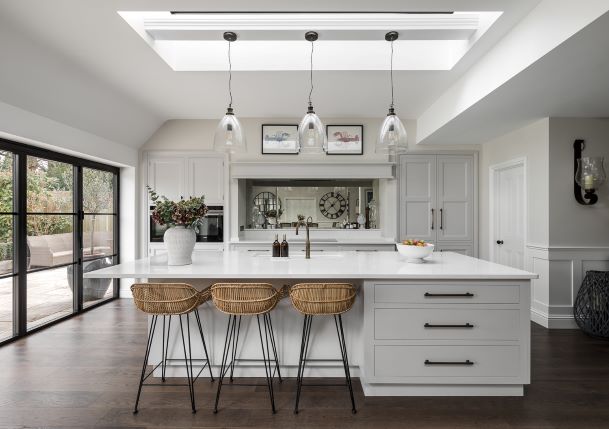 The kitchen units have been finished with Farrow and Ball paint in Ammonite, with this shade also featuring on the walls, enhancing the light in this grand open plan room, creating stunning impact.