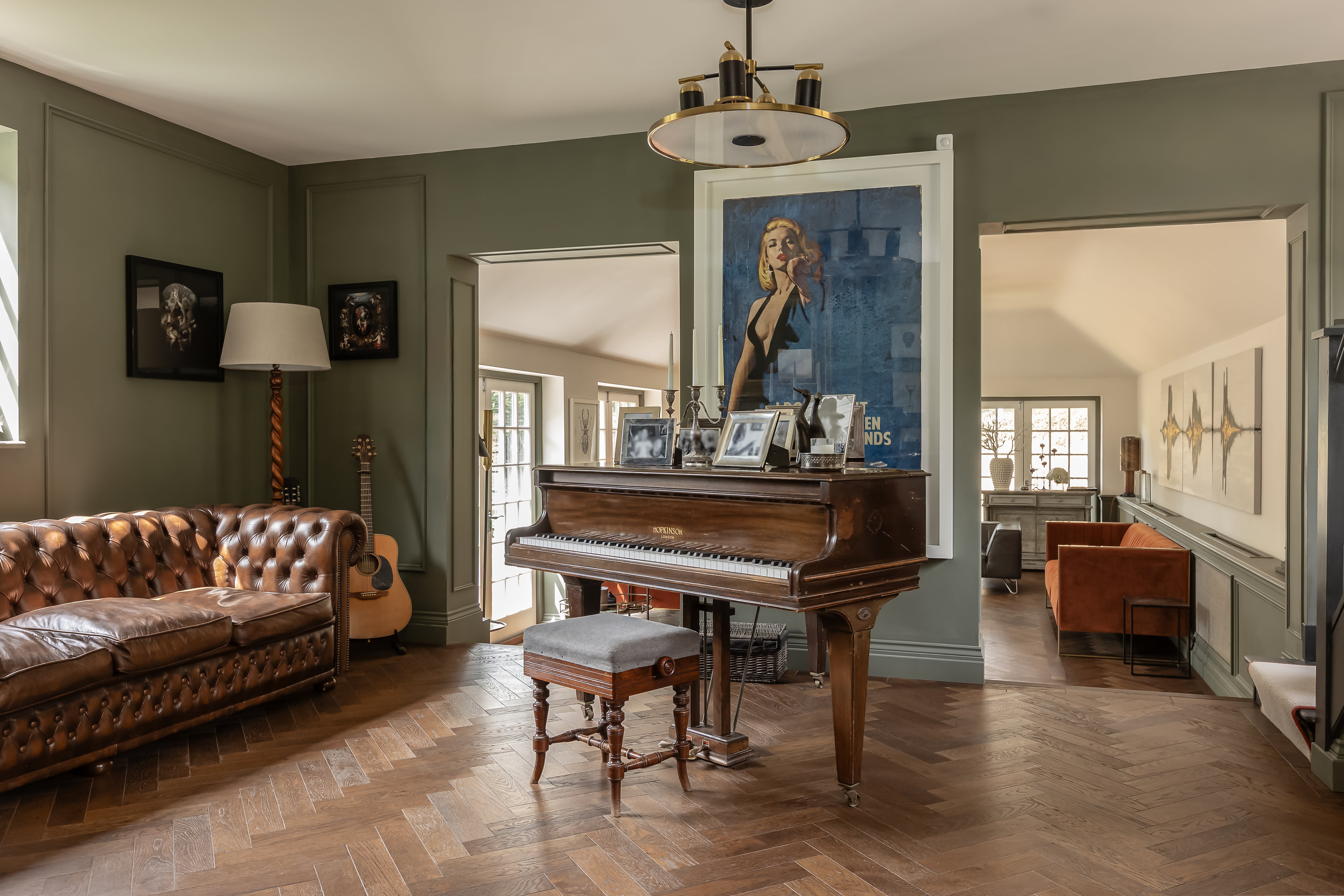 Character pieces and new modern elements come together in the design. The couple kept their piano and leather Chesterfield sofa, which brings a ‘Gentleman’s Club’ vibe into that area, with more modern furnishings styled into the main living room.