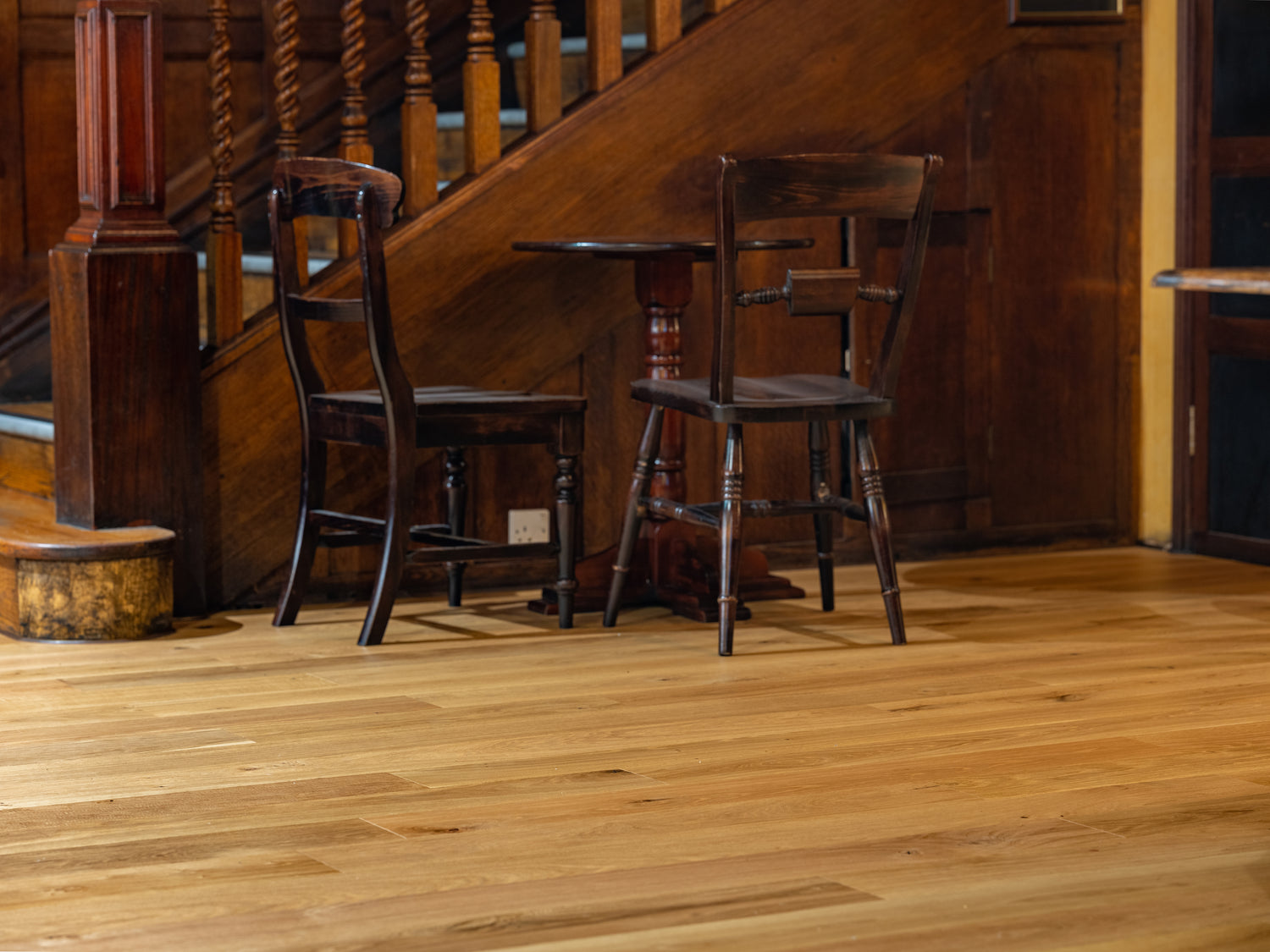 We’ve worked with V4 wood floors on both residential and commercial spaces in the past and they have always stood up really well to the high footfall and demands of hospitality venues. Knowing the more classic oak style the owners were looking for Gary was quick to recommend a floor from the long-running Alpine Collection. The collection features a menu of surface finishes and given the demands of the footfall on the surface Gary knew a lacquered surface would be best equipped for the job. Alpine Oak Rustic Brushed and Lacquered wood floors were selected. Mirroring the proportions of a traditional floor board this plank is ideal in both domestic and commercial interiors. The rustic oak surface is lightly brushed to remove the soft grain, leaving a hard wearing and tactile hardwood surface. 6 coats of aluminium oxide matt lacquer protect the surface whilst maintaining the natural oak tone. The resulting floor is easy to maintain and extremely resistant to everyday wear and scratching. A generous 4mm oak top surface also means the floors can be easily sanded and re-treated in years to come.