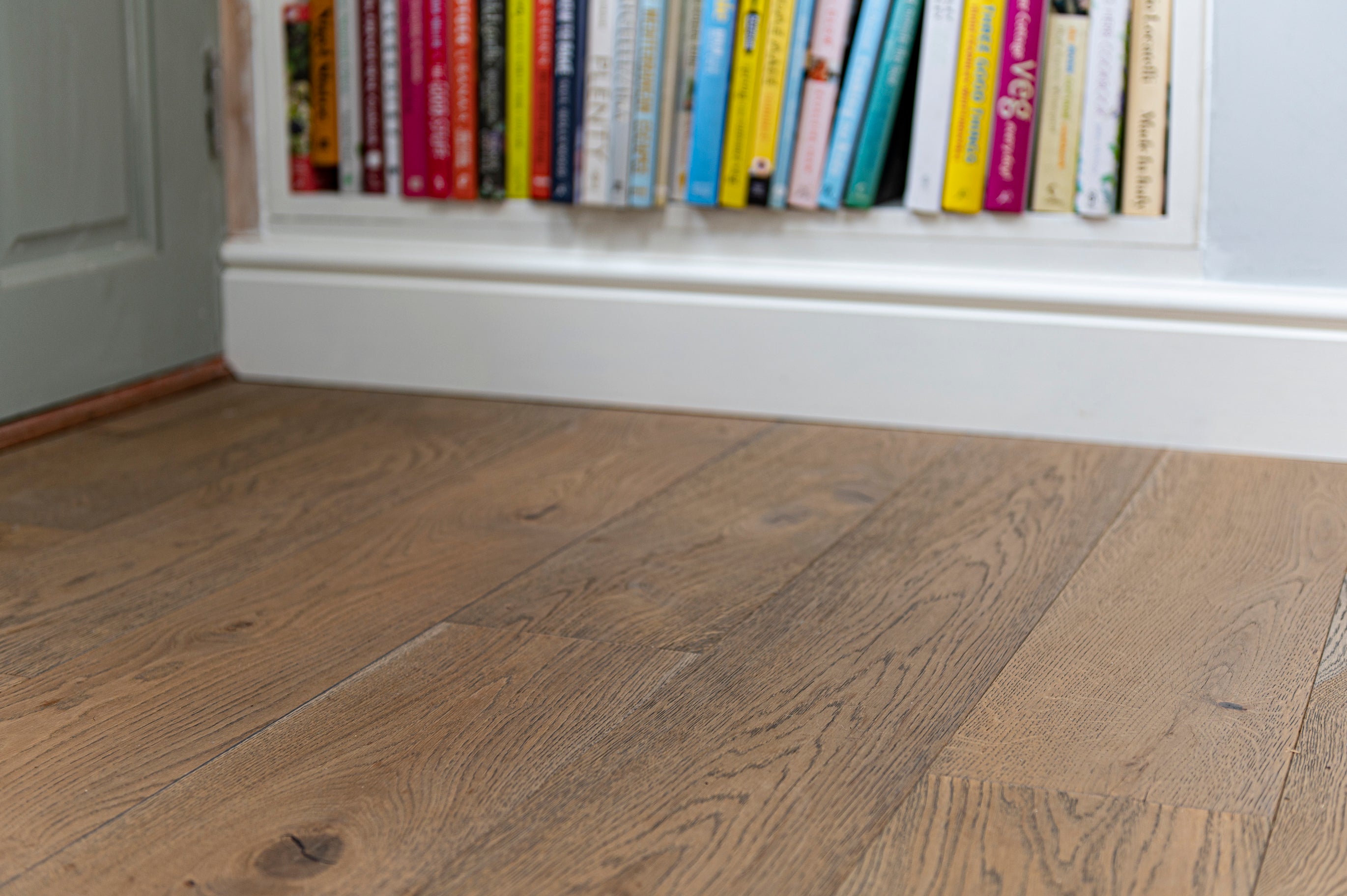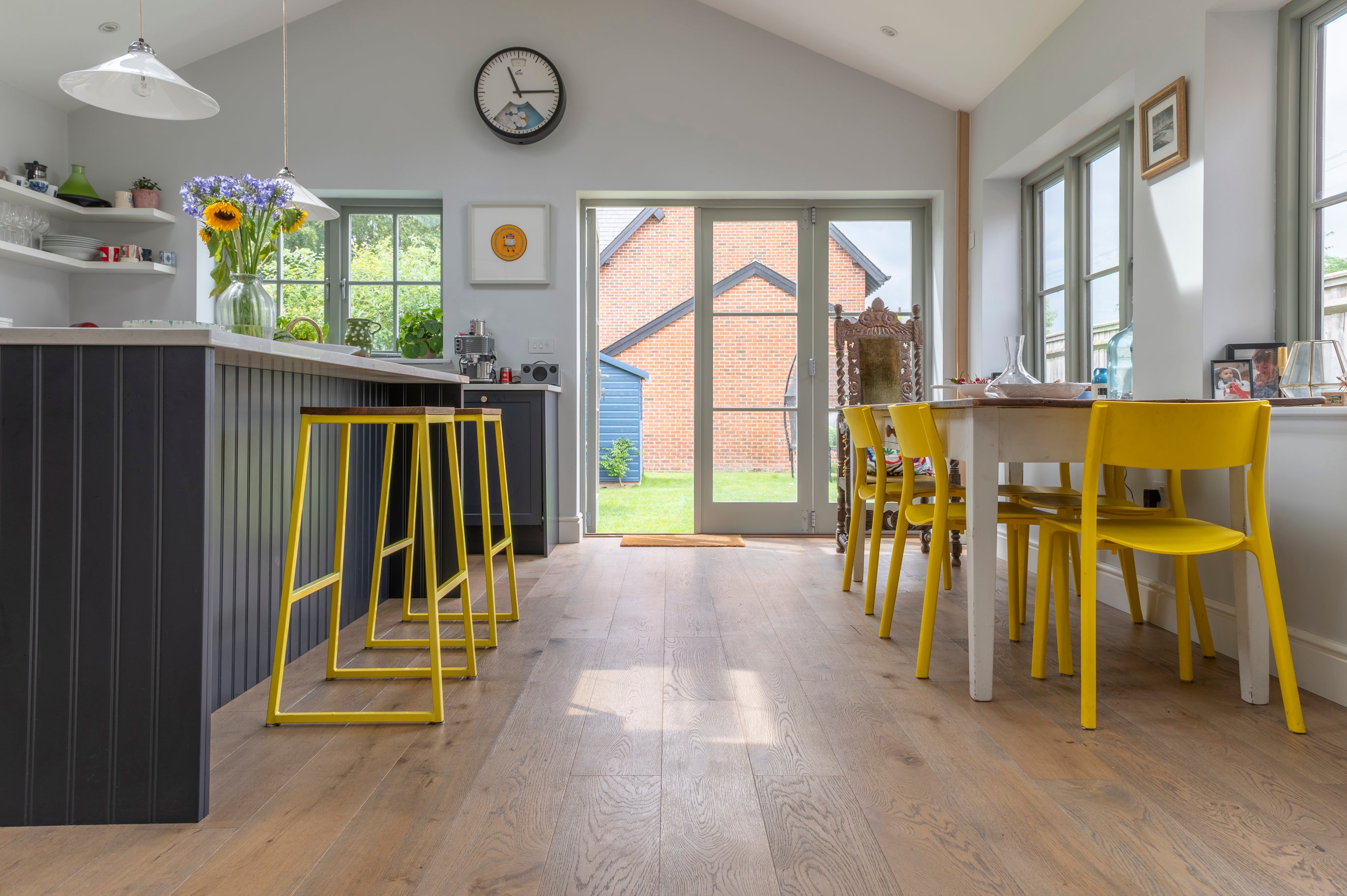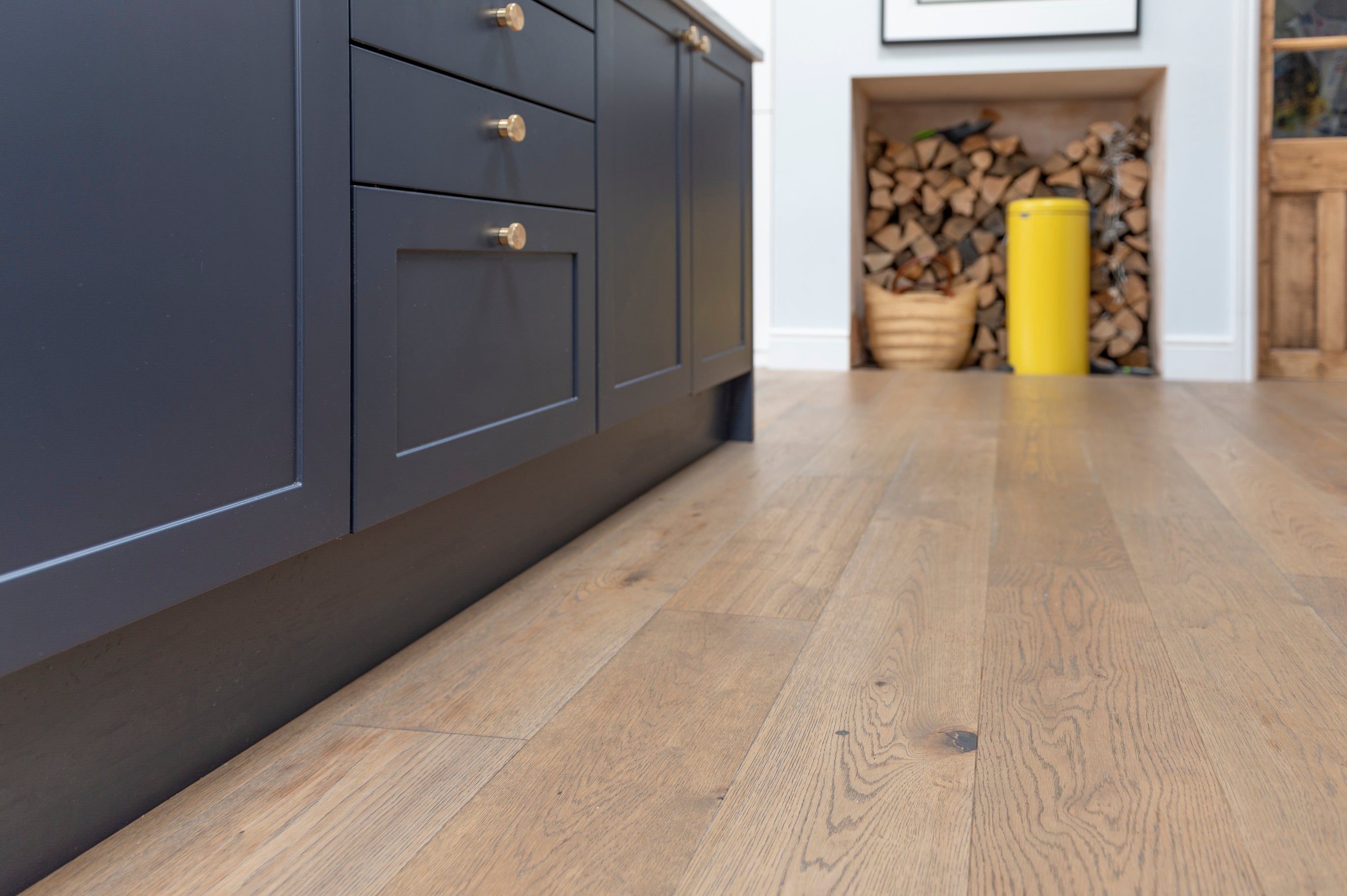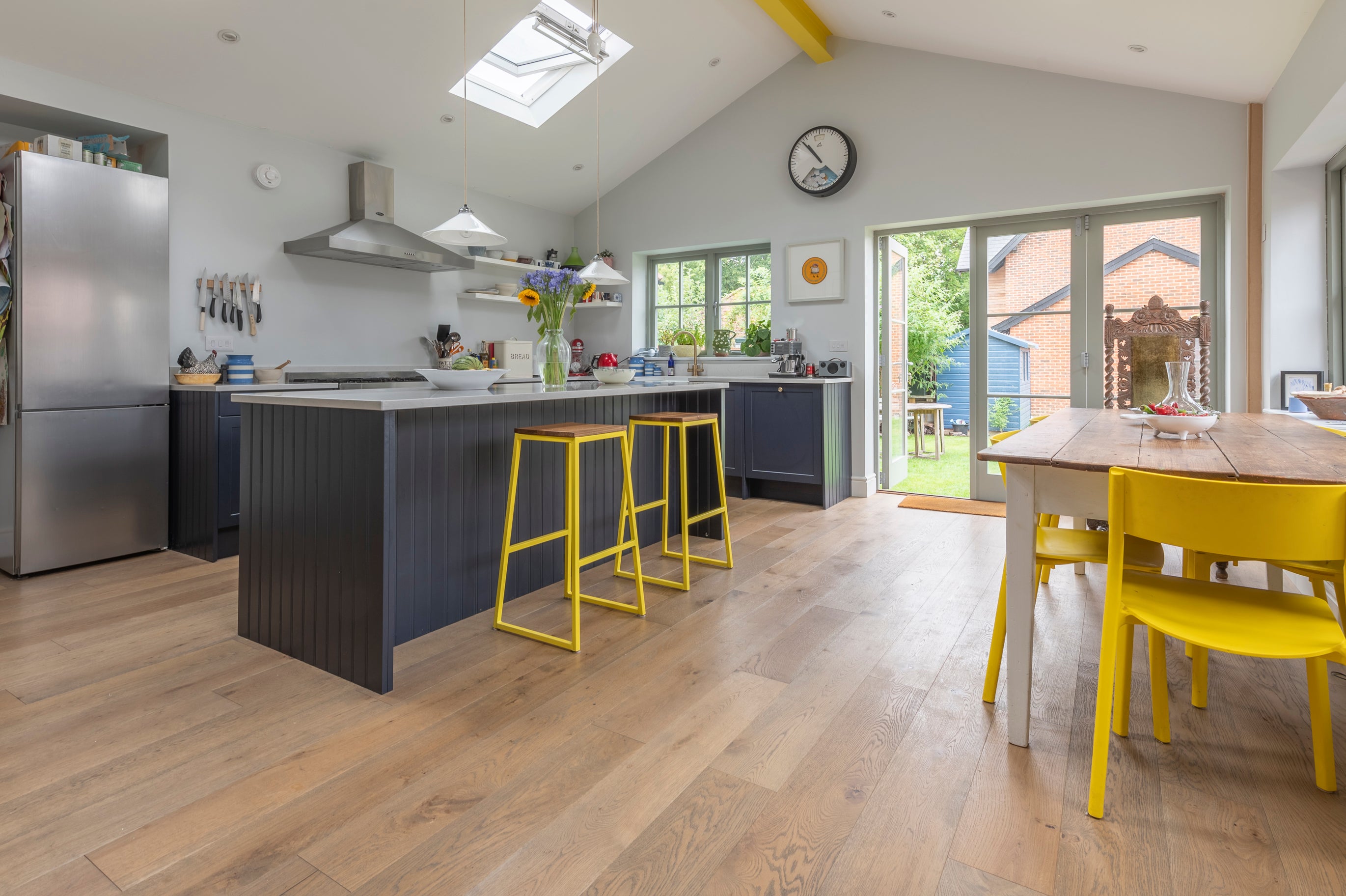 “We are thrilled with the finished kitchen and the wood floors are fabulous. The generous plank size and rustic nature of the boards add a lovely warmth that also enhances the feeling of space in here. People always ask about the floors when they visit, they have a really expensive solid wood feel about them, so they are surprised when we tell them they were great value engineered wood floors."
