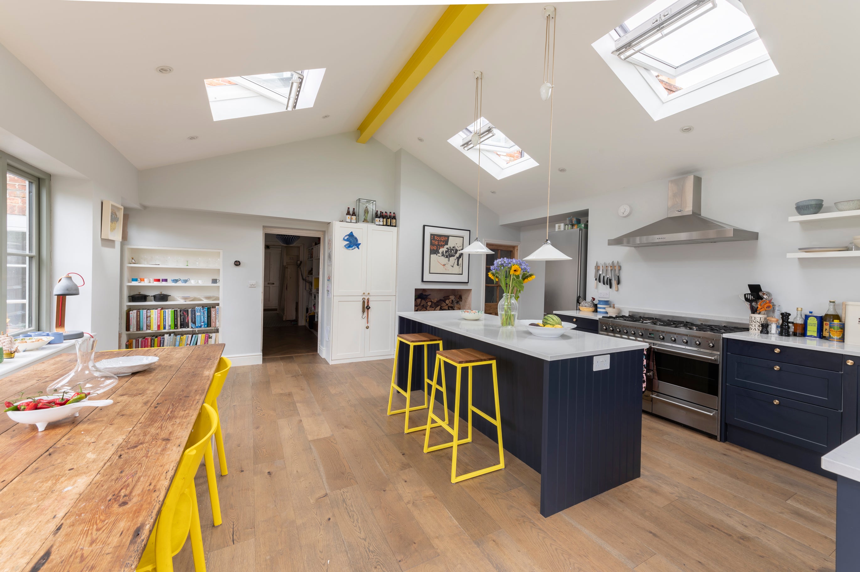 The yellow structural beam is the inspired choice of six year old son Eddie. "We could have had the beam boxed in but we thought it could look a little bit odd and ruin the aesthetic of the pitched ceiling. It needed to be finished in a fire proof paint due to building regulations so after a lot of debate on what colour to go for, my son’s love of yellow won the day." Yellow dining table chairs and yellow stools from Cult Furniture complete the yellow themed accent colour in the kitchen perfectly.