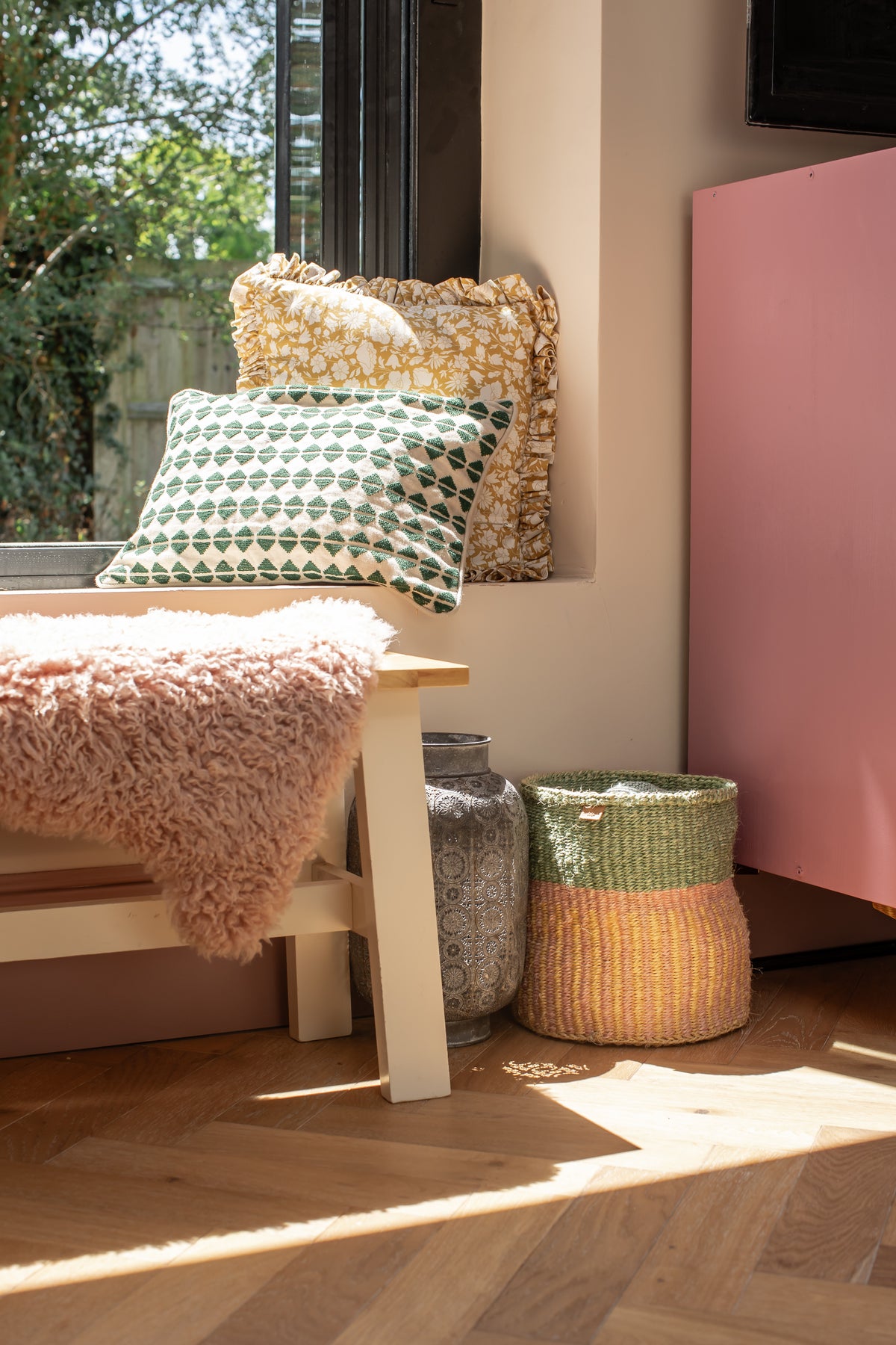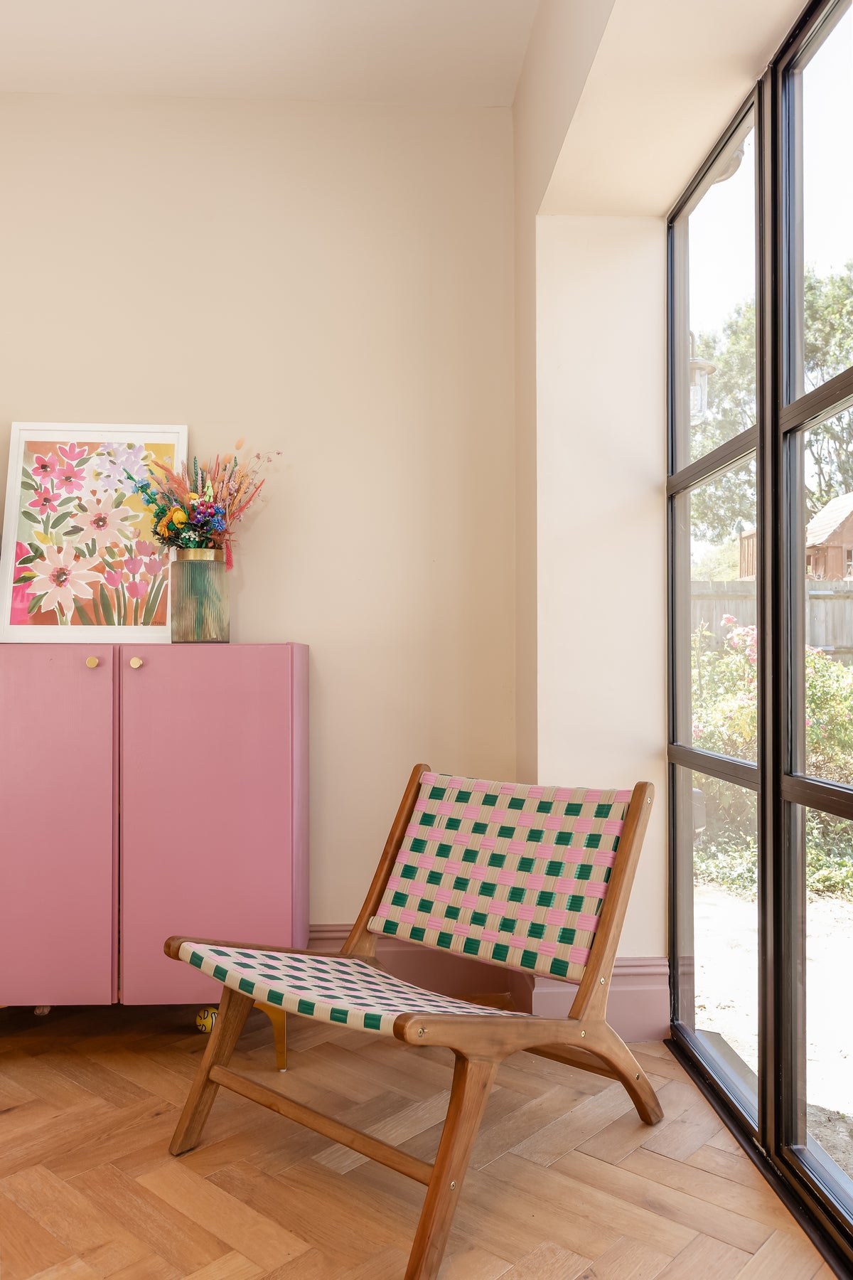 “The wood floors have been such a perfect fit with everything. All of the colours, especially the greens and pinks, sit so comfortably with them. I also love our handmade tiles which were made in Morocco. The entire kitchen wall behind the sink is tiled up to the ceiling and it really catches the light beautifully. We also used the same tiles in an intricate lattice pattern behind the fireplace which adds another colourful and unique feature to the room. And the bespoke curved kitchen island really elevates the kitchen design, especially with the playfulness of the swirled Murano glass pendant lights we installed over it.