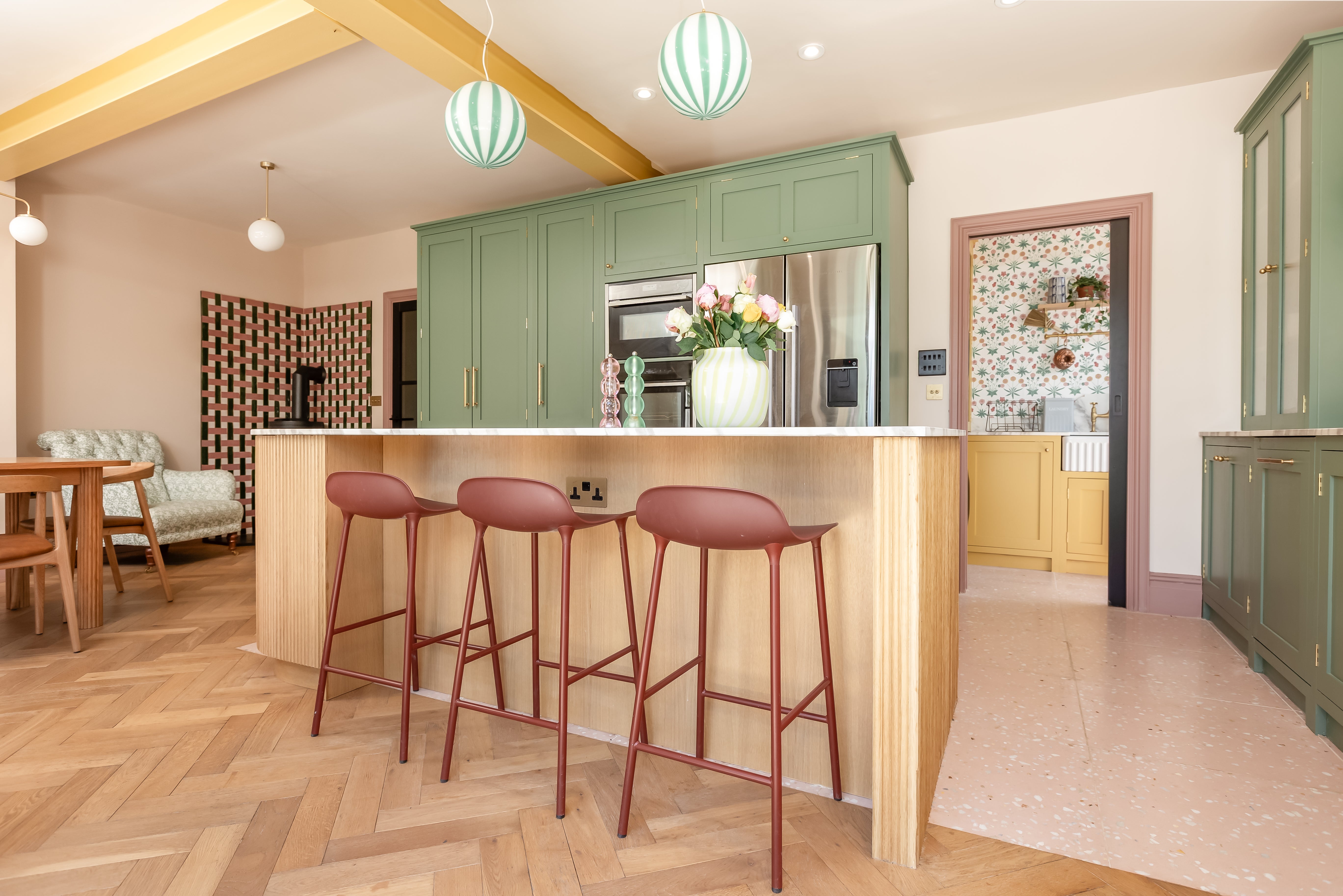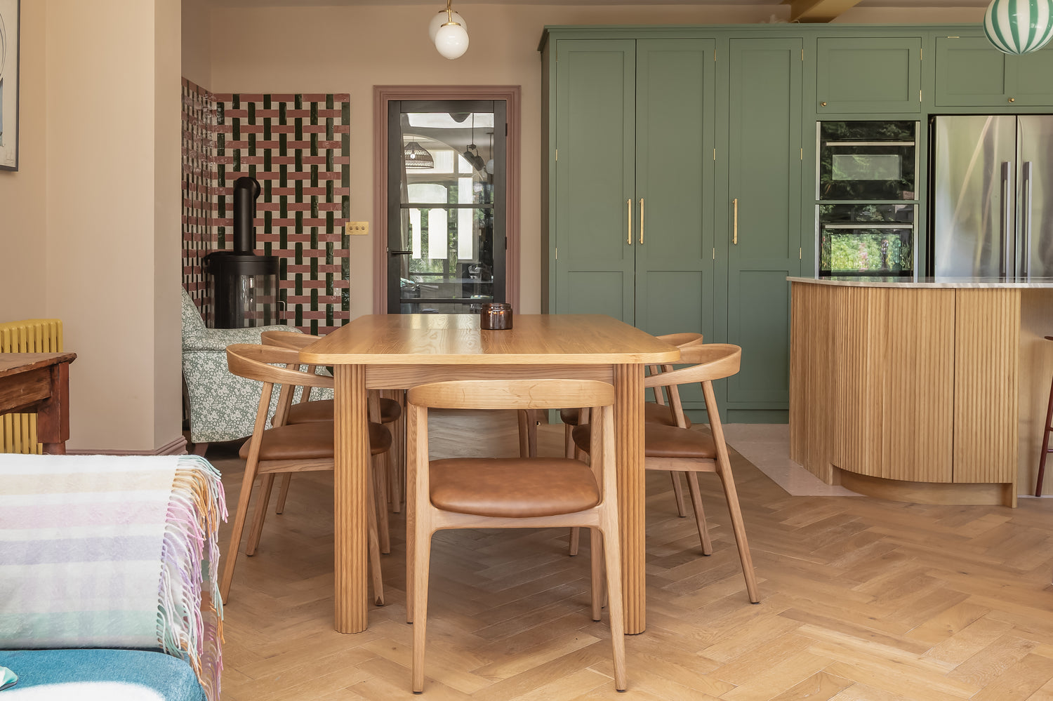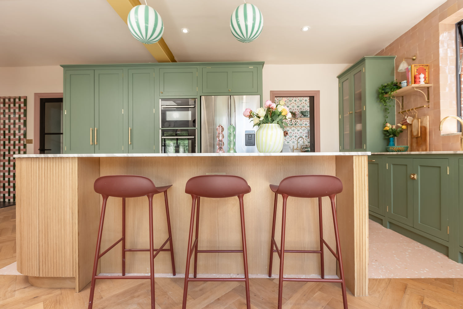“We’d been drawn to the idea of a green kitchen since the early stages of planning, so then I started to add-in other colour and texture ideas to layer around this. I’d seen some stunning curved fluted oak island ideas so this was something we designed in, and while we chose to tile the kitchen area with a Terrazzo style tile, I was keen to complete the rest of the room with a complementary oak floor.”