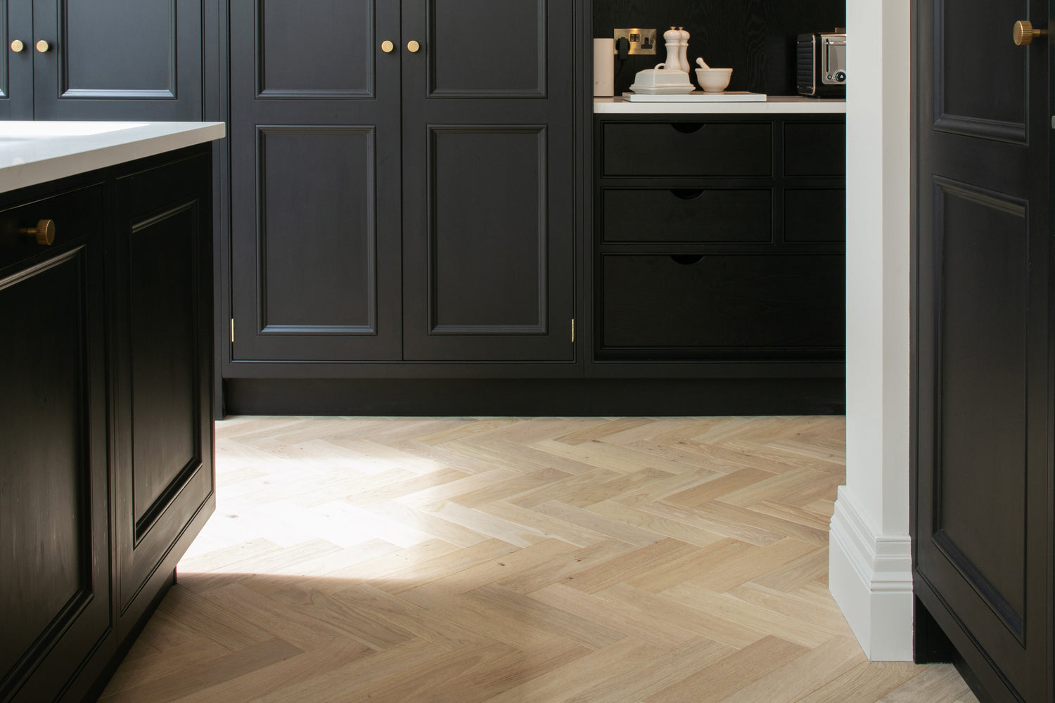 The design goal was to create a timeless neutral space with lots of light and a layout that flowed well with family life”, and their renovation achieved just that. With the downstairs floor fully complete with ZB204 herringbone, the design flows effortlessly from one room to another offering a beautiful open space to enjoy family time. And when it comes to the furnishings, Carly explains the house is still a working progress interior wise, with lots of finishing touches and furniture decisions to still be made, and key pieces to be found. I mainly get inspiration from other Instagram accounts and Pinterest”. One of the most eye-catching rooms in the house is the fantastic kitchen design. Complete with stunning dark units from Crouch designs that perfectly contrast the Tikkurila paint and Shore Drift Oak herringbone flooring. The couple wanted to create a light space with statement accents, which is beautifully achieved with the contrasting details throughout the home, Carly explains:
