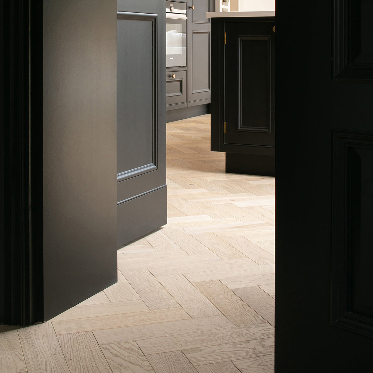 Shore Drift Oak is a brushed herringbone floor complete with an invisible natural lacquer that helps maintain the aesthetic of a raw untreated oak whilst offering a hardwearing and protective wear layer. When discussing their inspiration for the floor, Carly explains: