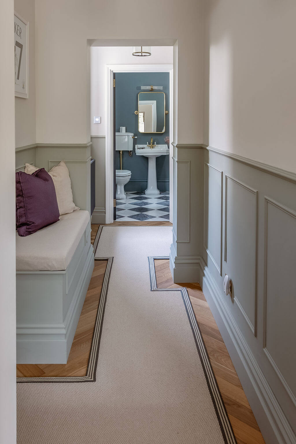 Wellington Flooring fitted the herringbone floors, and installed carpet in the bedrooms and living room. They also added a bespoke hallway runner which flows from the living room carpet, creating a thoughtful connection between the different floor finishes.