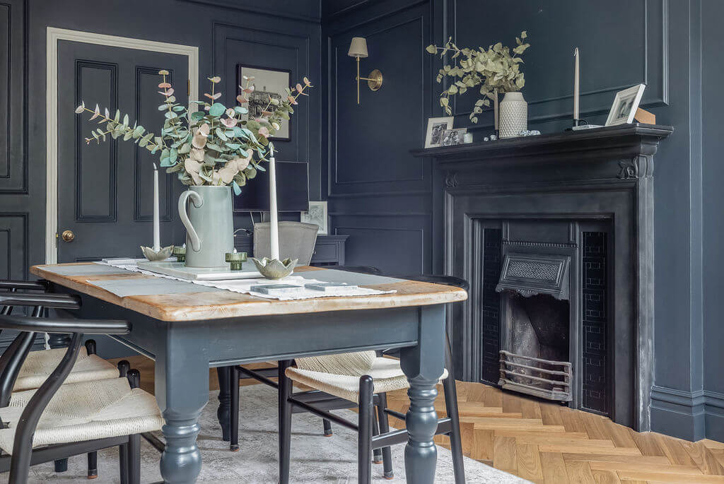 The herringbone flooring has been installed to the entrance hallway, kitchen and dining area, complementing the bespoke skirting and panelling created by Neil. Steph’s colour palette works wonderfully with the muted tones of the wood floor, seamlessly making the transition from the lighter toned spaces and into the darker dining room.