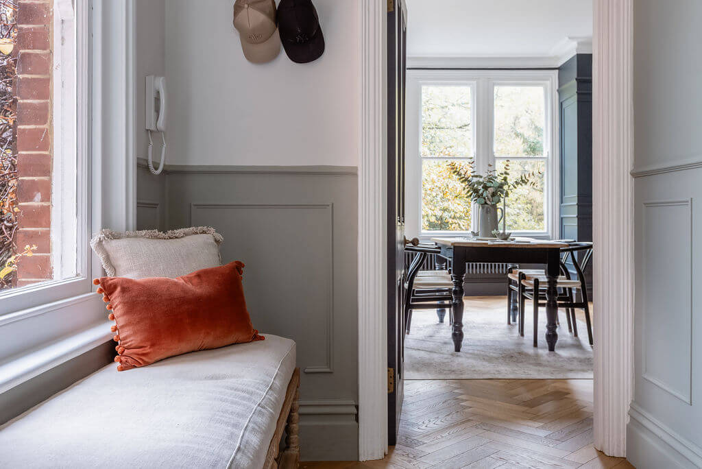 Panelling has been thoughtfully incorporated throughout, integrating storage, shelving and window seats, restoring a sense of Victorian elegance, whilst feeling fresh and contemporary.
