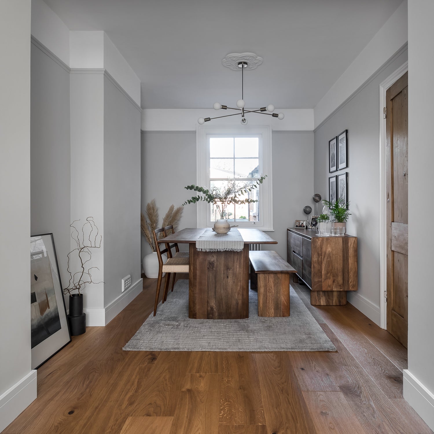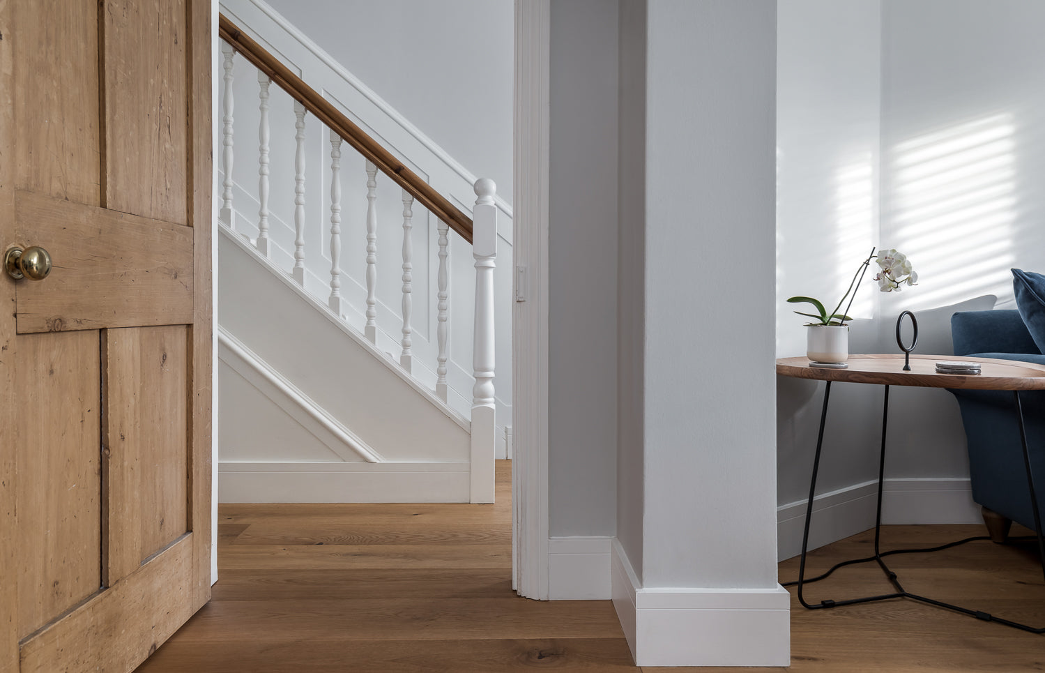 “We chose that floor because we felt it matched well with the property, it has a lot of texture and character to it. It is a lovely Victorian property and we wanted to bring some of that character inside, which we achieved through the use of wood. We were always going to have timber, but wanted something that had texture and character, it has the character, offering a contemporary feel whilst maintaining the character with the knots, grains and texture from the deep brushing that suited the Victorian property. The overall style is a blend between contemporary and traditional, we have kept a lot of the traditional elements from the original property, such as the traditional cornices and ceiling roses, we reused and upcycled the old doors that had been in the projects for over 100 years, the lighten fixtures we rubbed down and sprayed with a matt black paint to give a contrast between the wall colours. keeping the traditional elements and design features but giving a contemporary feel.”