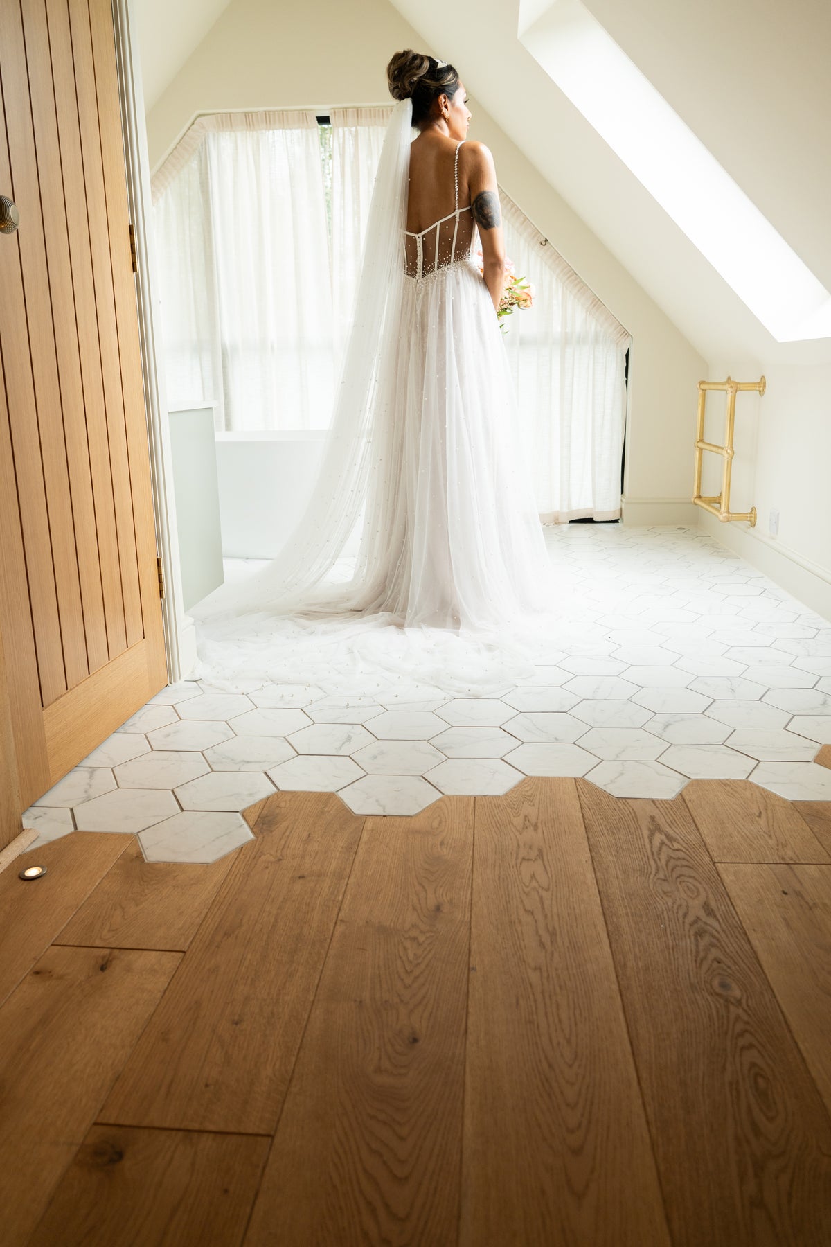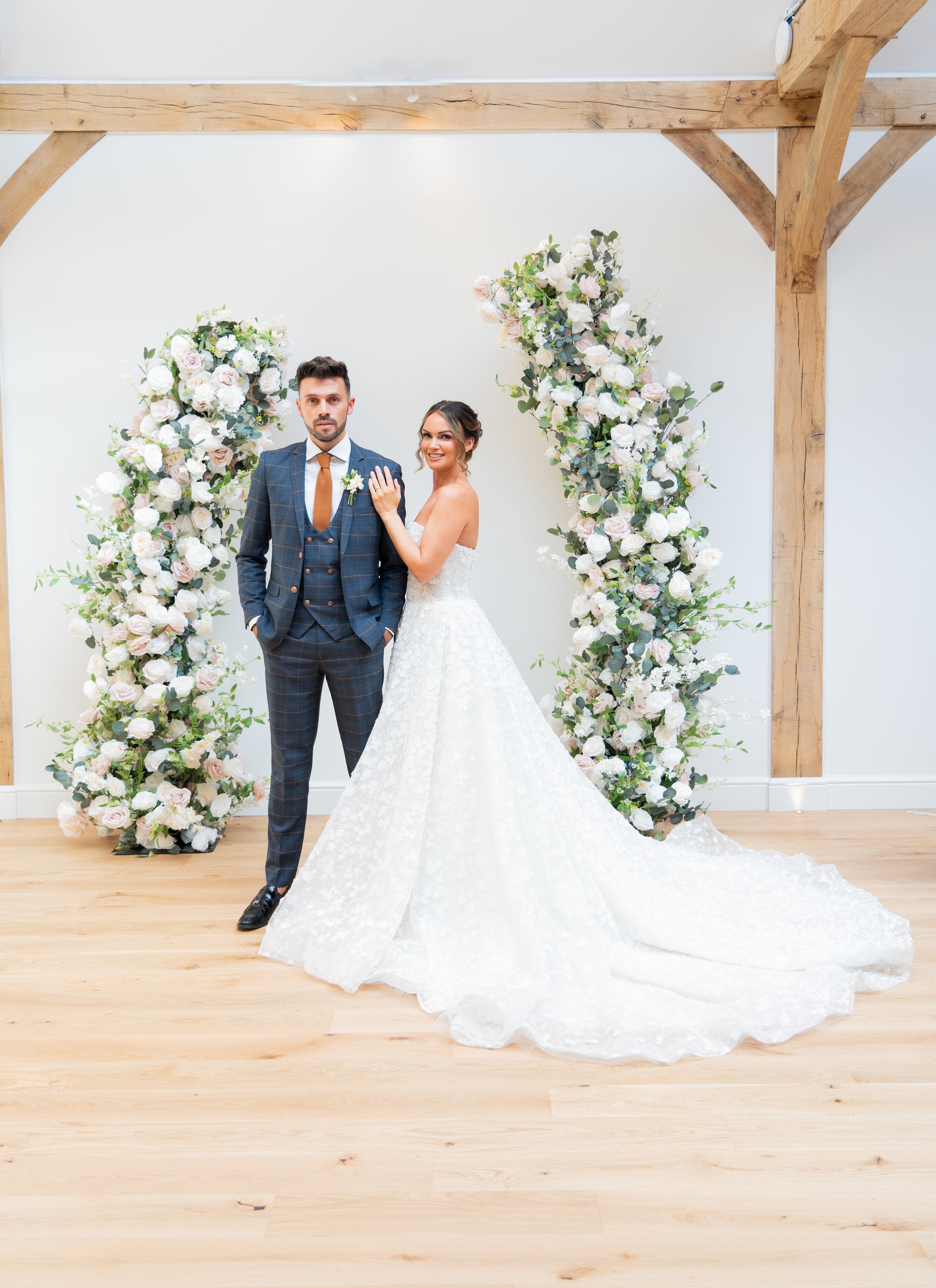 Installed by our award-nominated and trusted partner Designer Contracts, to ensure a flawless finish. The final design beautifully accentuates the barn's rustic charm, a characteristic that makes the venue so popular for couples choosing their wedding venue. A103, perfectly mirrors the exposed wood beams on the walls and ceilings of the barn, creating a cohesive feel throughout the space that is bursting with character.