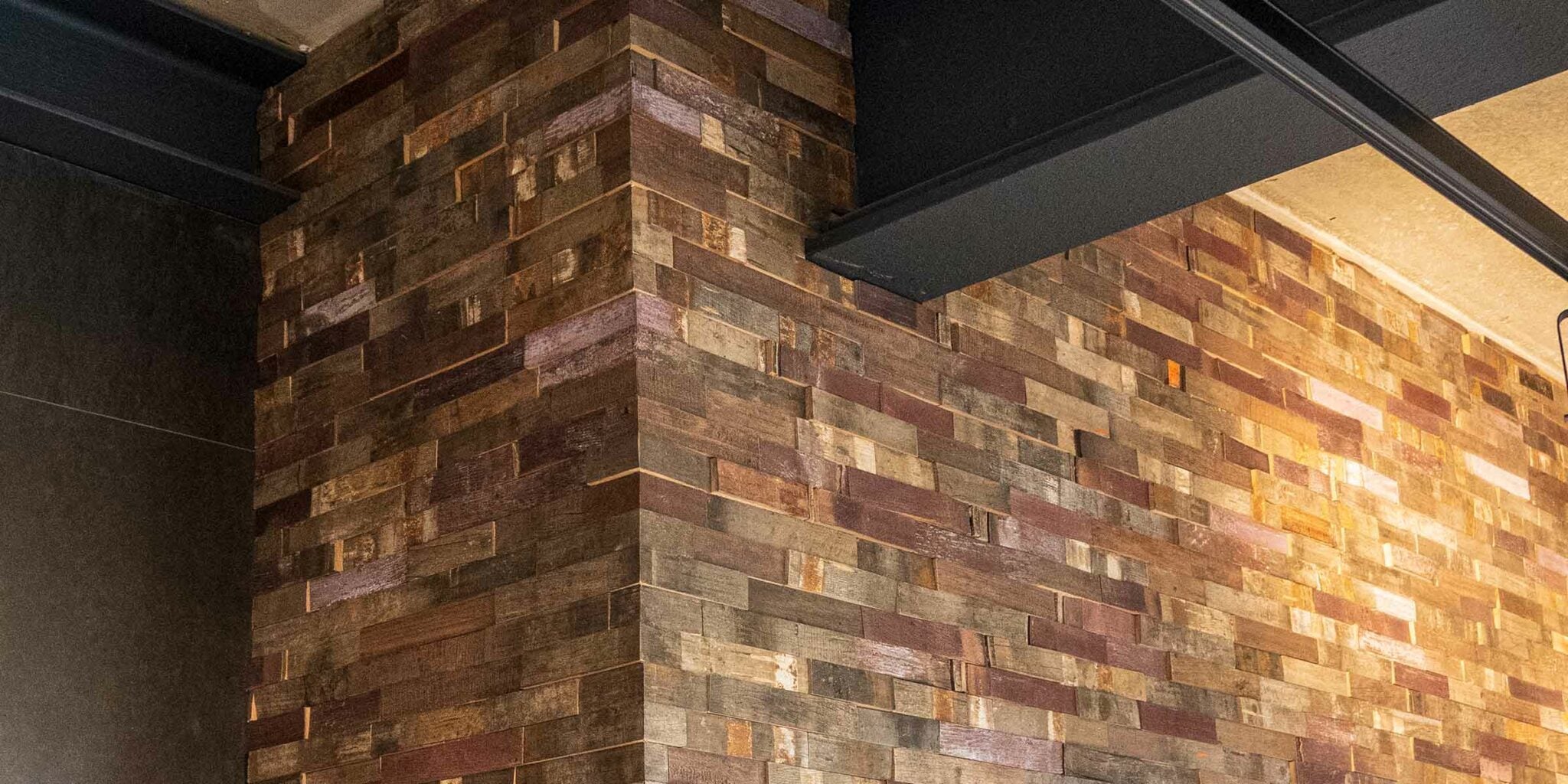 The decorative reclaimed and recycled staves of wood are bonded to a hardboard backing and the panels fit seamlessly together by means of a finger joint.