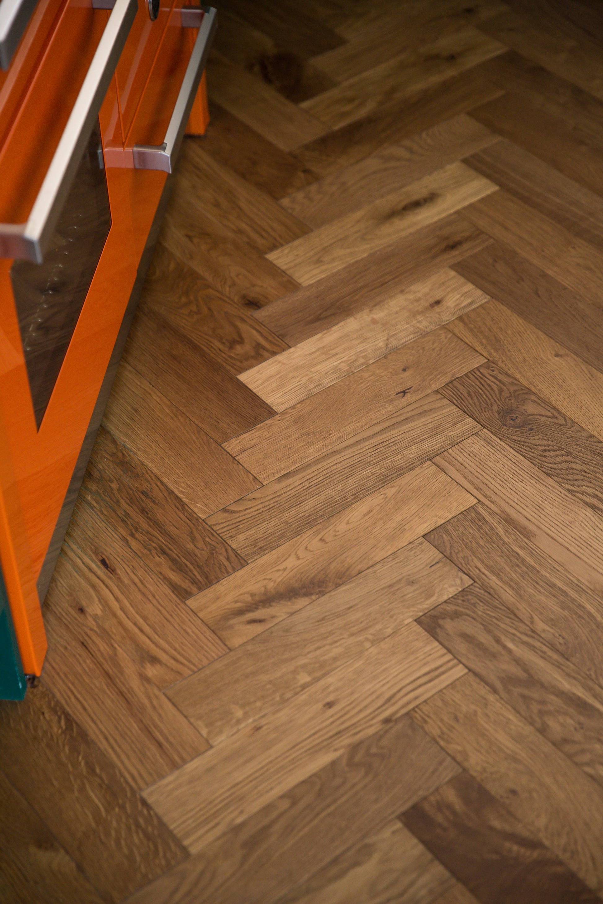 Smoked Oak herringbone is stored in a smoke filled chamber that ages the timber. This process darkens the grain to a rich honey tone, complemented with areas of darker oak and occasional streaks of blonde sap wood. The blocks are then brushed and sealed with cured clear oil which accentuates their warm hue, whilst maintaining the tactile surface in all its natural beauty.