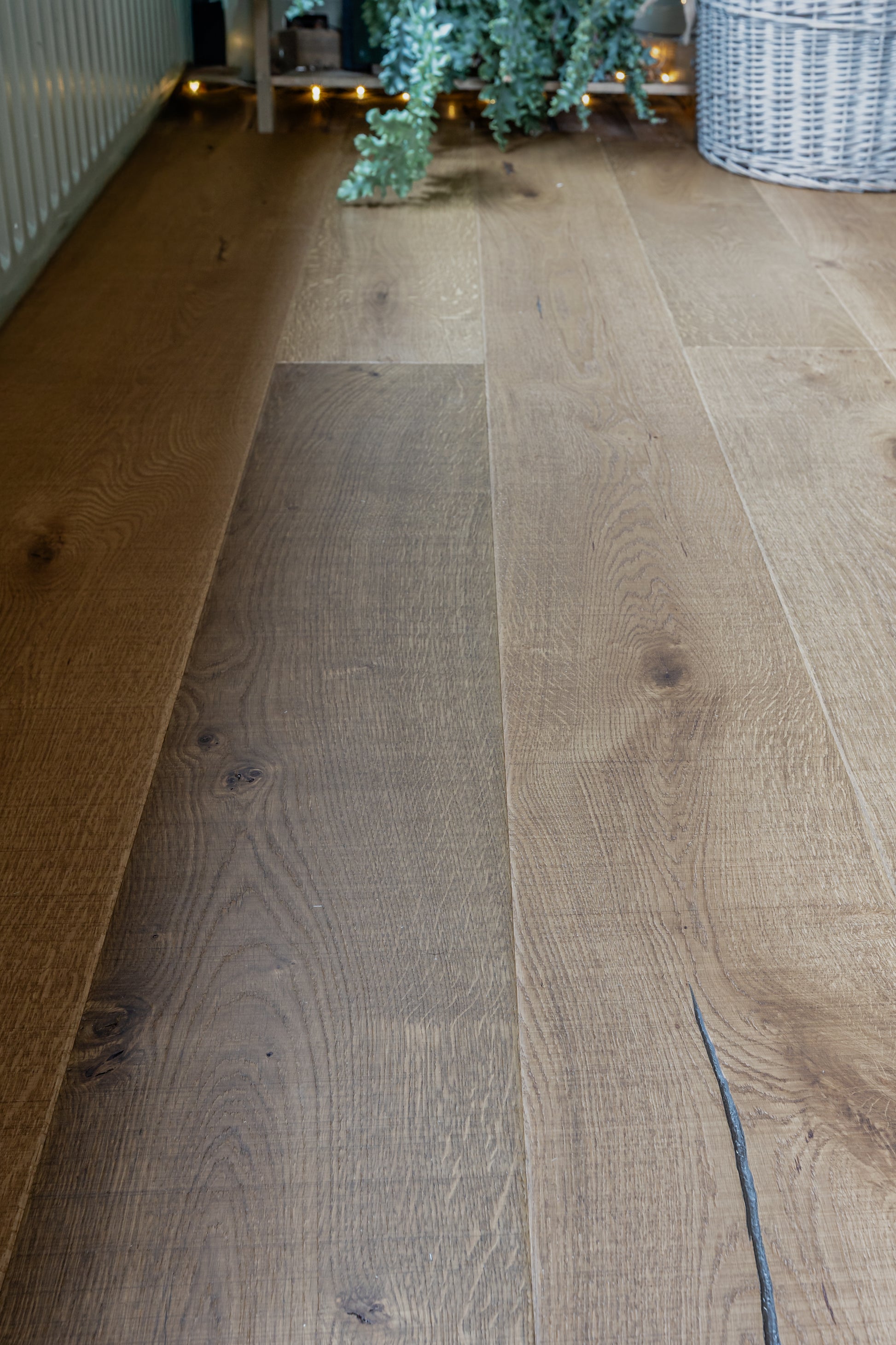 Our Urban Nature Amberwood planks have been intentionally smoked and distressed to create a homely worn and aged appearance. After undergoing subtle hand-scaping and cross-sawing effects the boards have a UV Oiled applied which locks in their warm golden glow and protects the surface. Their beautiful rustic aesthetic is enhanced further by the oak planks generous dimensions, producing a striking and timeless rustic wood floor.